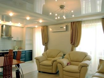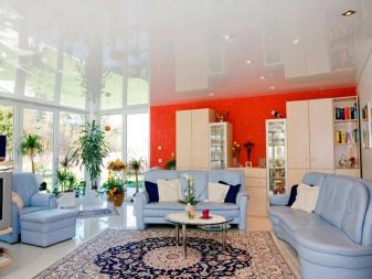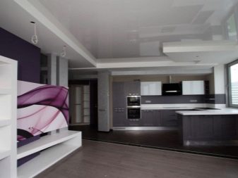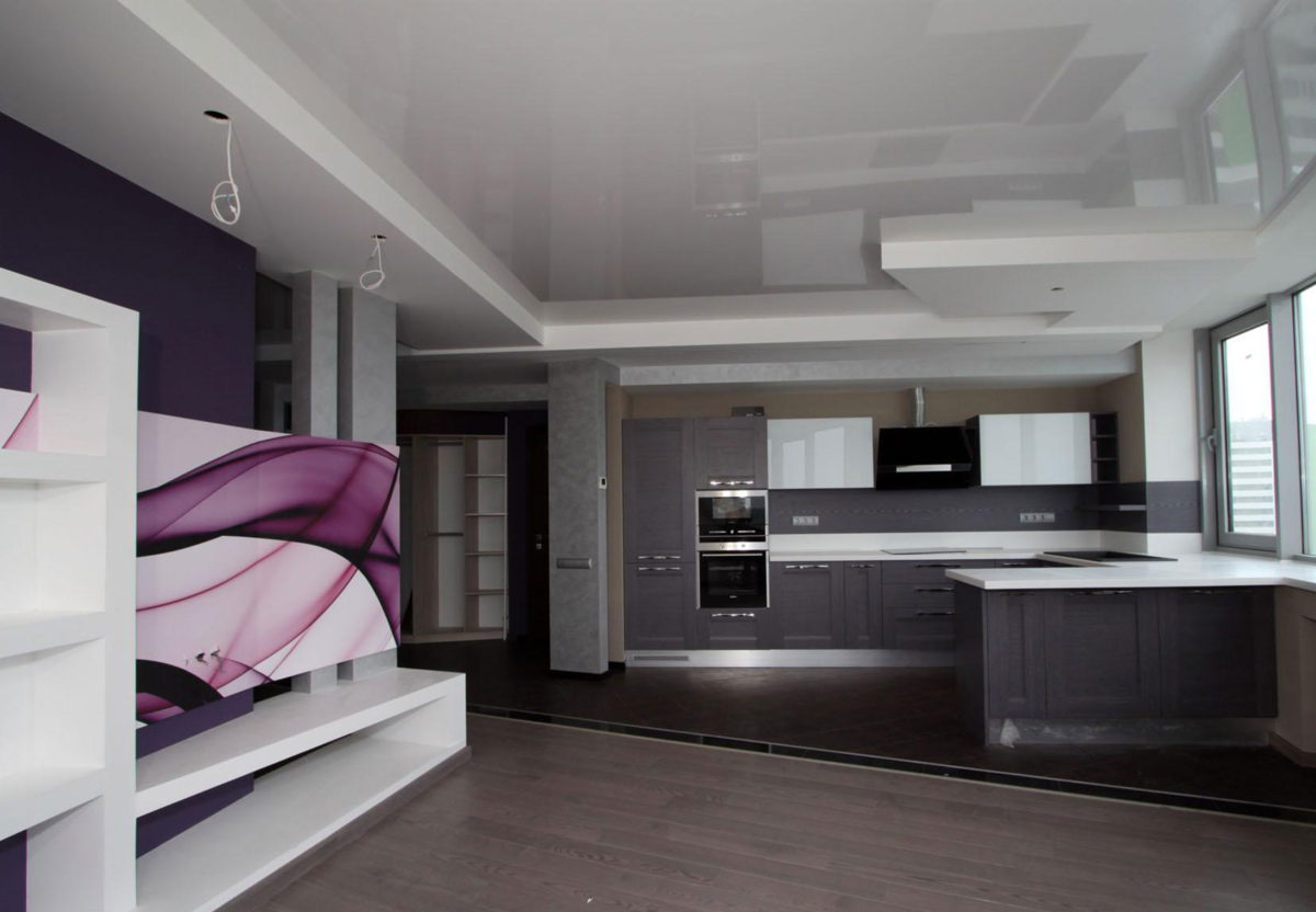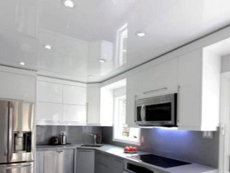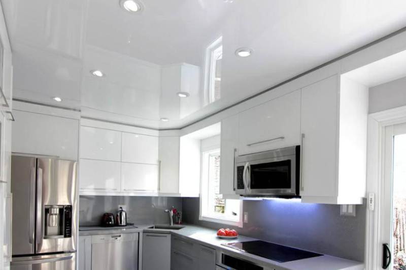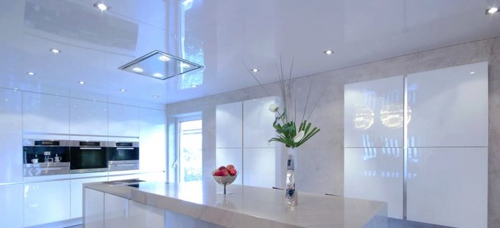 In the kitchen, a glossy PVC ceiling, besides moisture resistance, will be appropriate due to the fact that it does not soak up smells and is easy to clean, but the gas stove must be equipped with a good hood, otherwise its heat may destroy the coating. In addition, dust hardly adheres to the glossy ceiling.