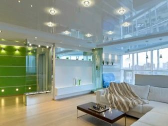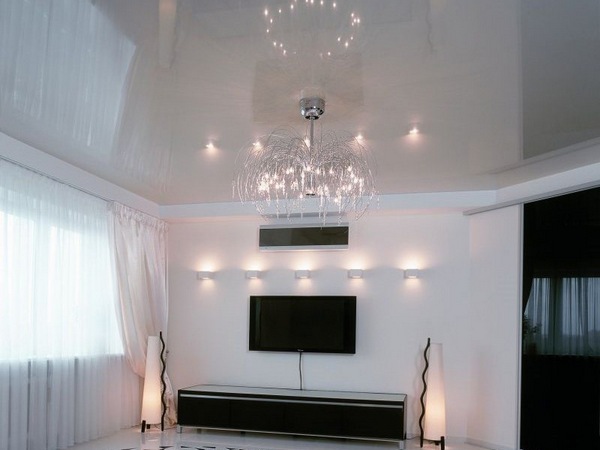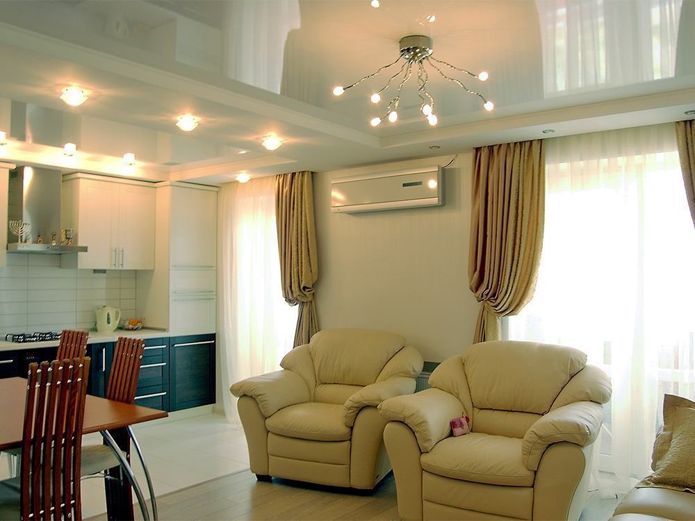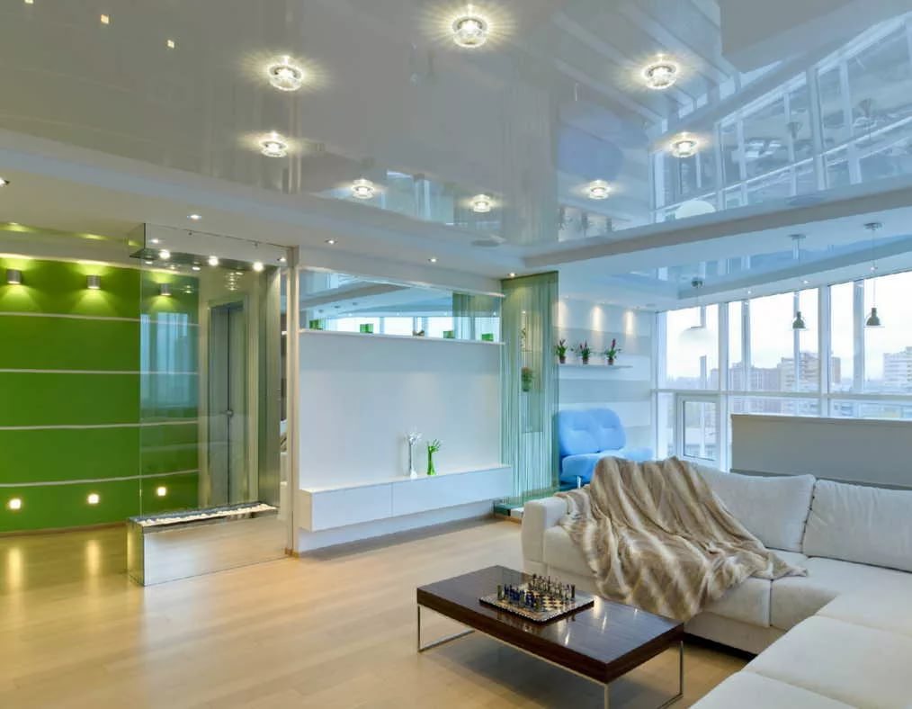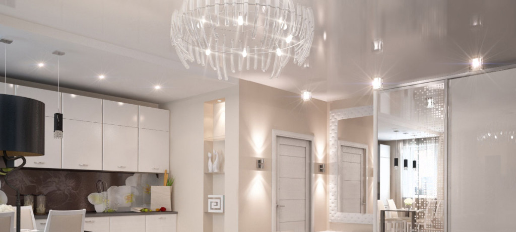 Glossy texture due to the mirror effect visually increases the volume, in particular, the height of the room. The light from the lighting devices, refracted from the "mirror" surface, spreads throughout the room, filling even the shadow areas.