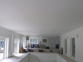 White stretch ceiling, imitating knitwear, is not recommended for use in the kitchen because of its impregnation with odors and moisture, and besides, evaporating during cooking, food microparticles will settle in its fibers, which will lead to damage to the fabric and structure over time. In the bathroom, although moisture will not destroy polyester, a mold fungus will multiply on such a surface.