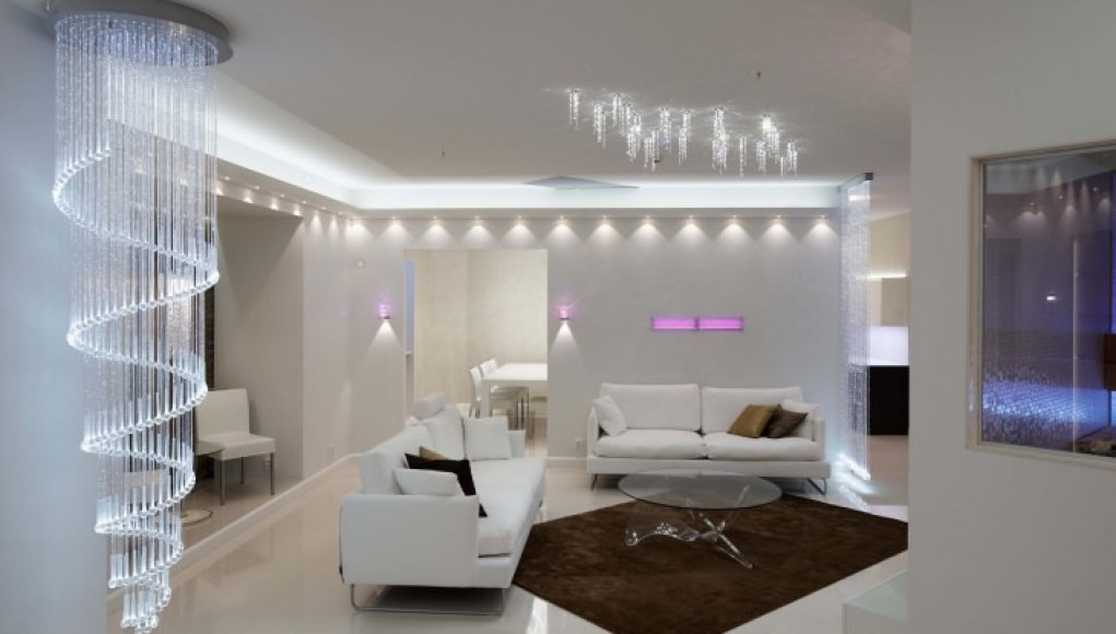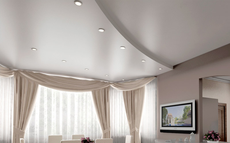 - White satin ceiling gives the room elegance, sophistication and refinement and can be appropriately combined with designer interior solutions.