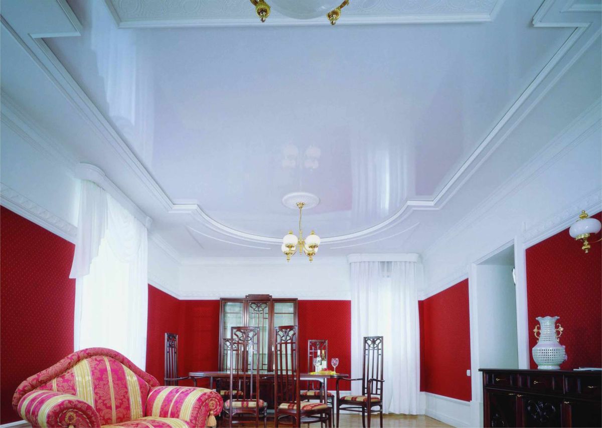 - White stretch ceiling with glossy texture through glare and reflections will make the room visually more voluminous and give a festive atmosphere. The surface of such a product is perfectly smooth, which is practically unattainable for other types of finishing works, such as painting or putty, due to the enormous costs of leveling the plane.