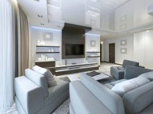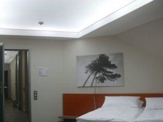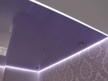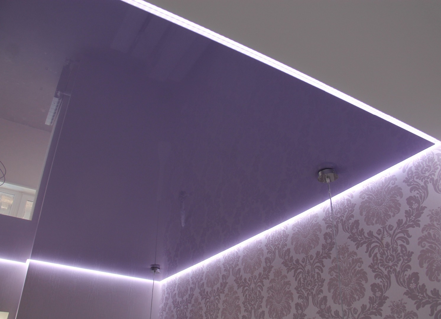 Using the built-in perimeter LED lighting creates the effect that the ceiling does not touch the walls, but hangs in the air. Such a design technique is not only attractive in appearance, but also allows you to hide the joints of the canvas with the wall.