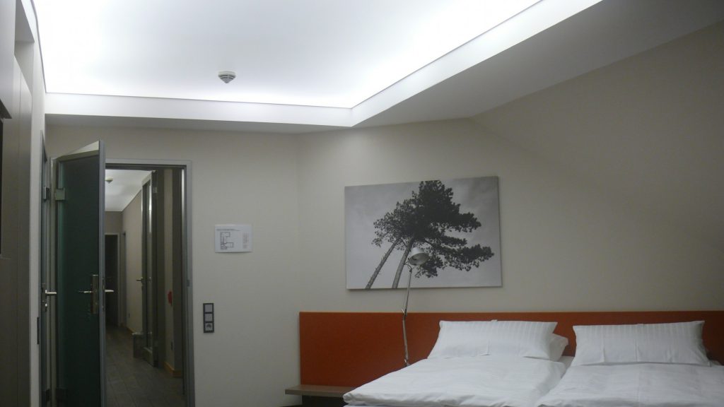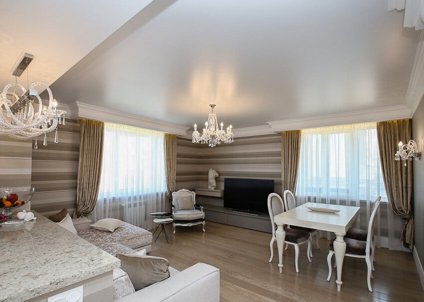 - Noise absorption. Stretch ceiling mutes extraneous sounds. This is especially important if your house has thin walls.