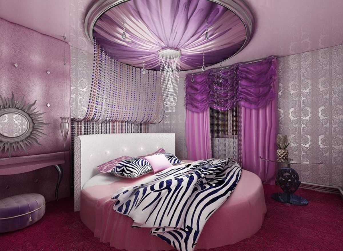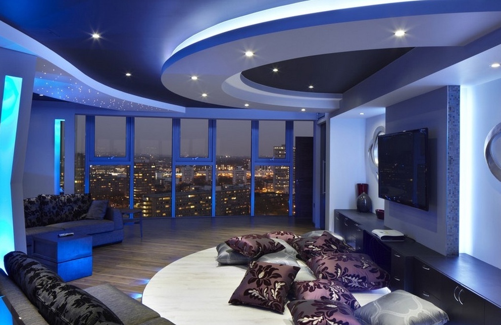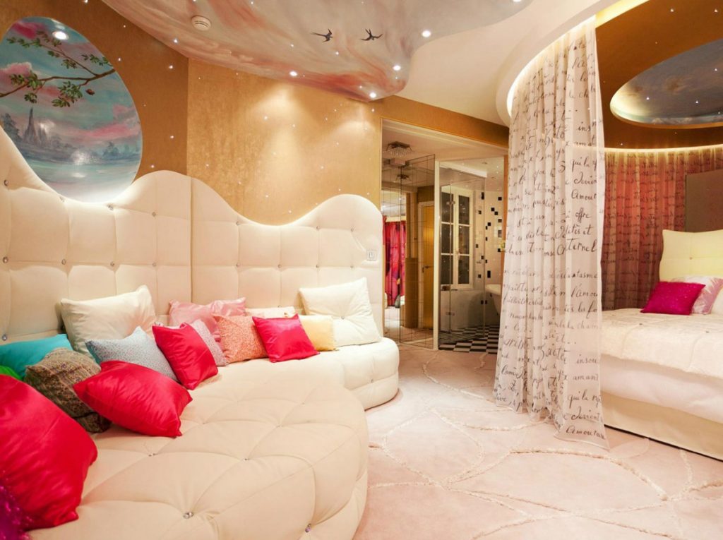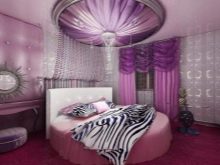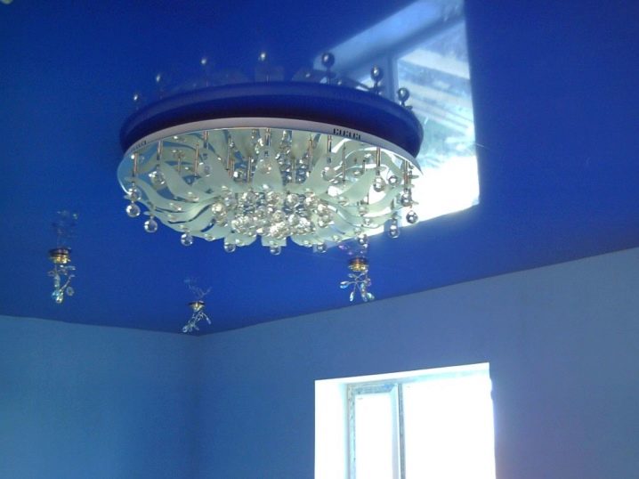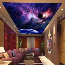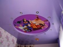 The most vivid and even acid shades are used to finish the kitsch-style ceilings., while the use of photo wallpapers is permissible. Ceiling in this style are welded or domed.