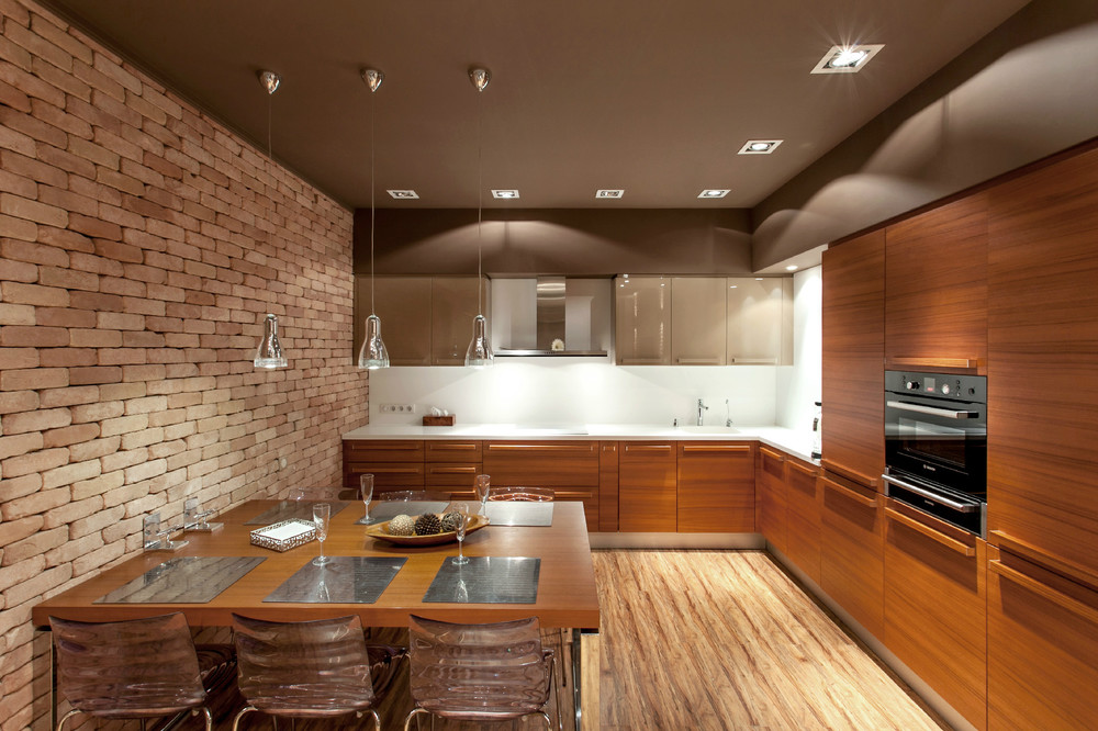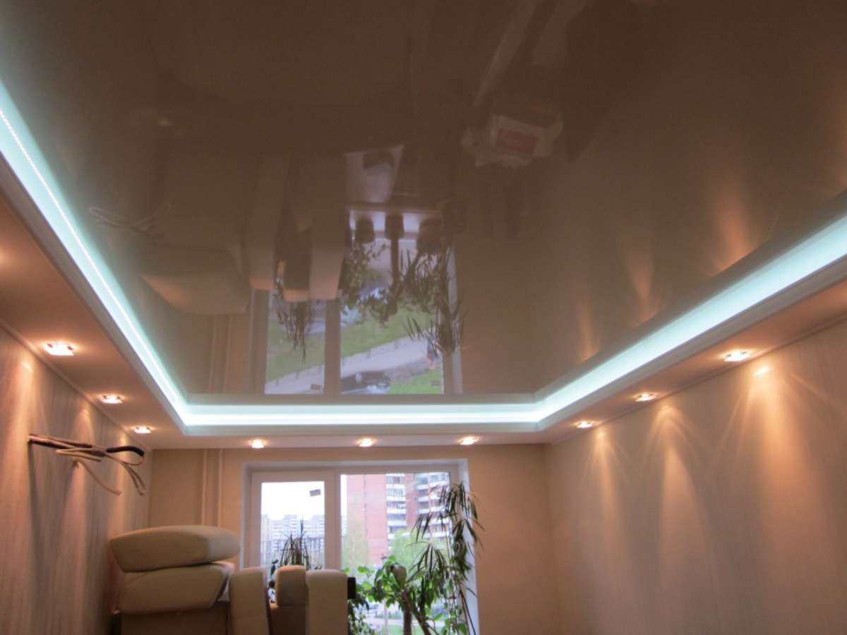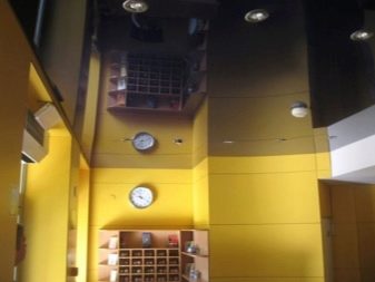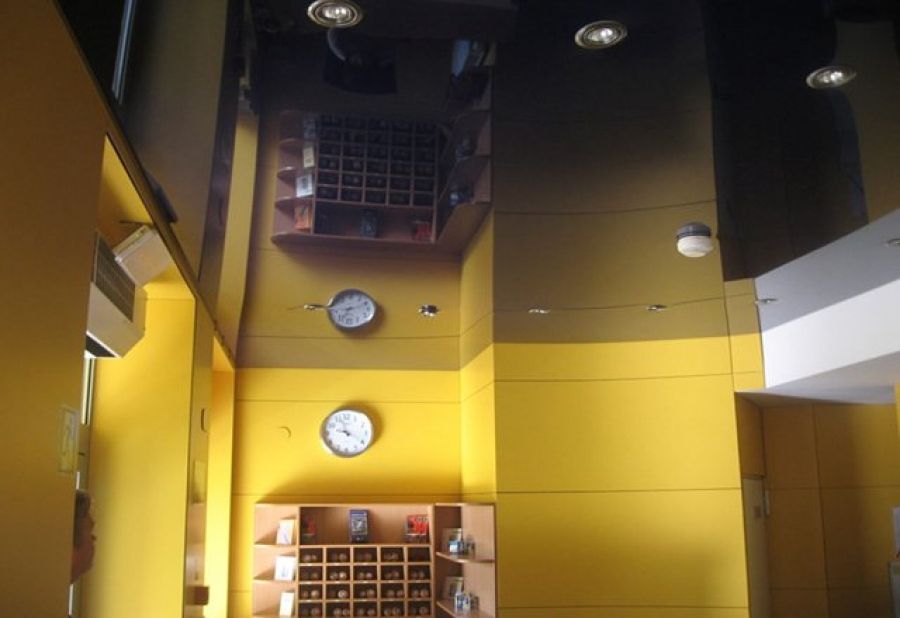 The most popular design solution is a combination of glossy brown ceilings and faceted mirrors.which are located along the wall.