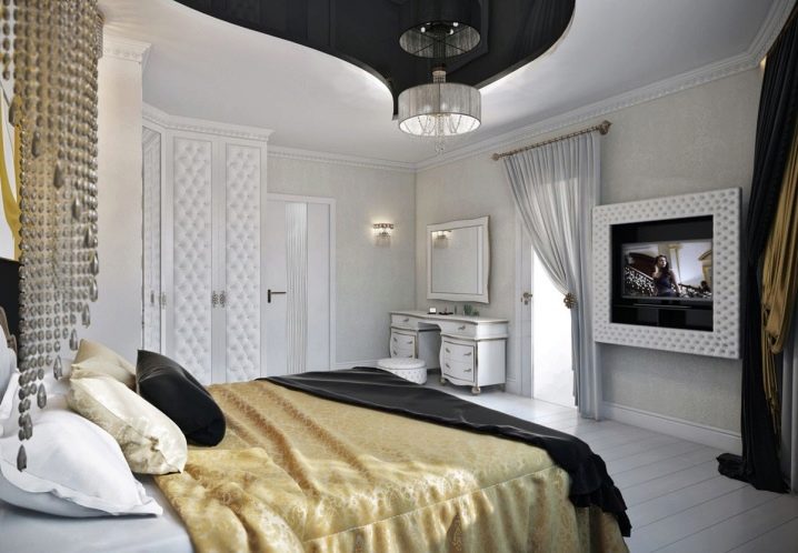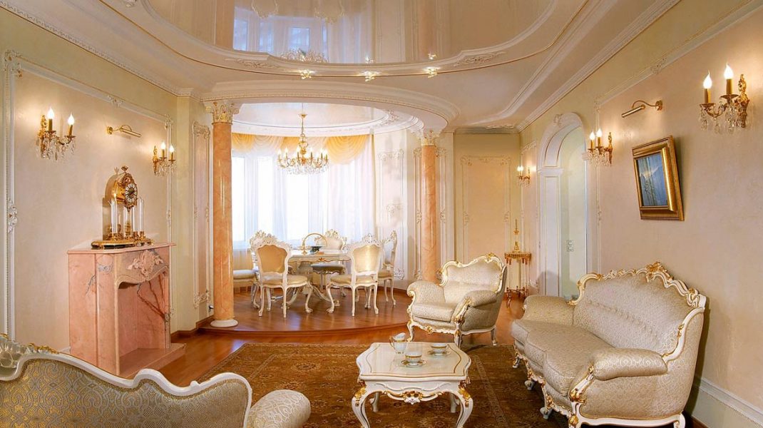 In this case, you can use matte ceilings, decorated around the perimeter of textured stucco with gold.