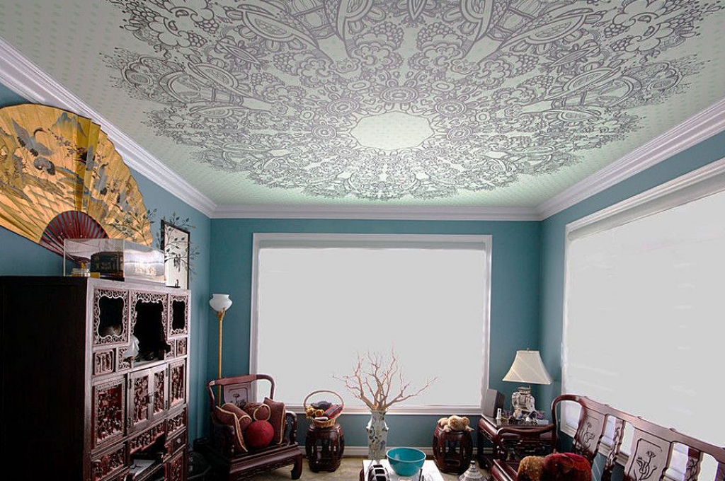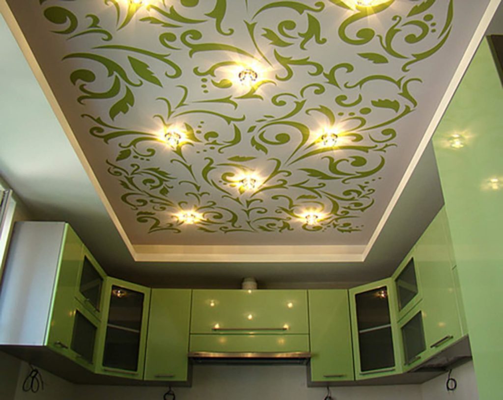 It is interesting to look at the interior stretch ceilings with photo printing in the form of various patterns and drawings. This solution allows you to create a certain contrast and bring an unusual accent into the interior, which at the same time does not attract too much attention.