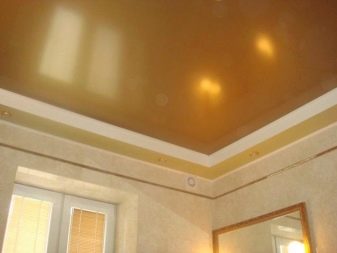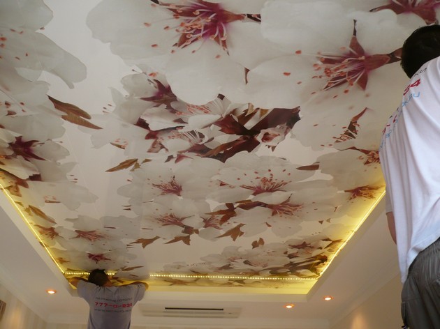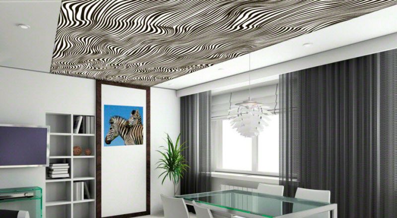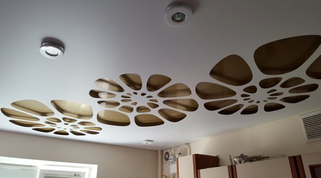 The usual decor of tensioned cloths is wood, stone, painted in different colors of the coating, but other options are possible, which depend only on the strength of the designer’s imagination. Even a simple one-level ceiling can be made unique if you choose the right color and texture. However, you can combine and seemingly incompatible things, in combination giving exactly the effect that is required.
