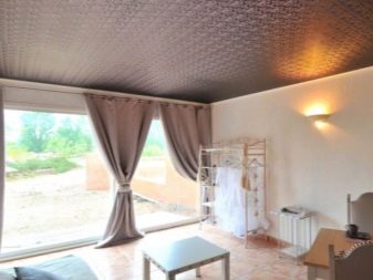 - Very original is suede textureimitating the features of natural leather, its velvety and visually noticeable warmth. This fabric can finish the ceiling in the living room or bedroom: it adds to the atmosphere a special charm and comfort.
