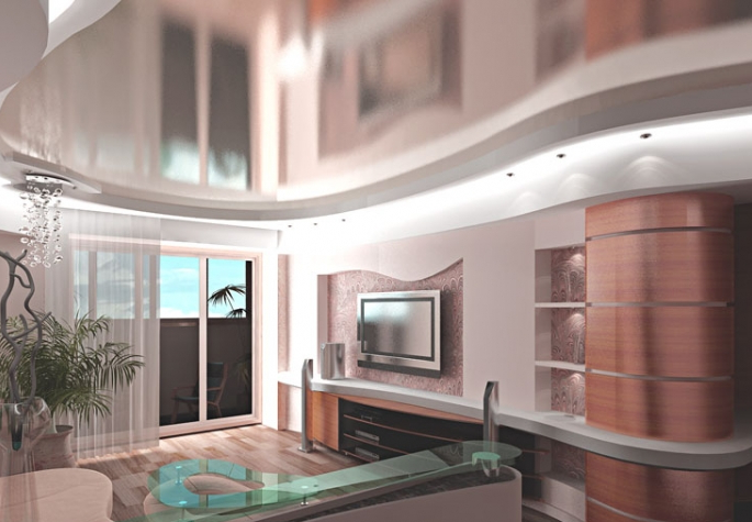 - Glossy (lacquer) surface. Able to increase the amount of space. Used to create separate zones in the room, dark corners for this reason are smoother. These are, as a rule, light-reflecting options with mirror properties.Glossy texture looks great in both single-level and multi-level ceiling construction, well combined with a matte texture.