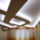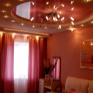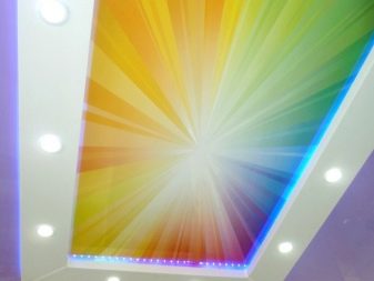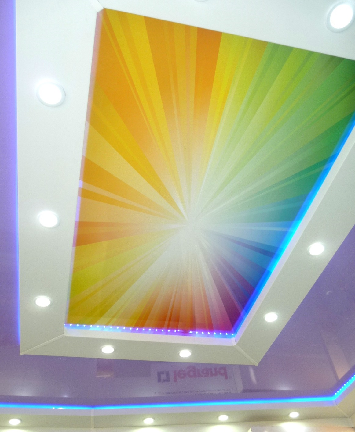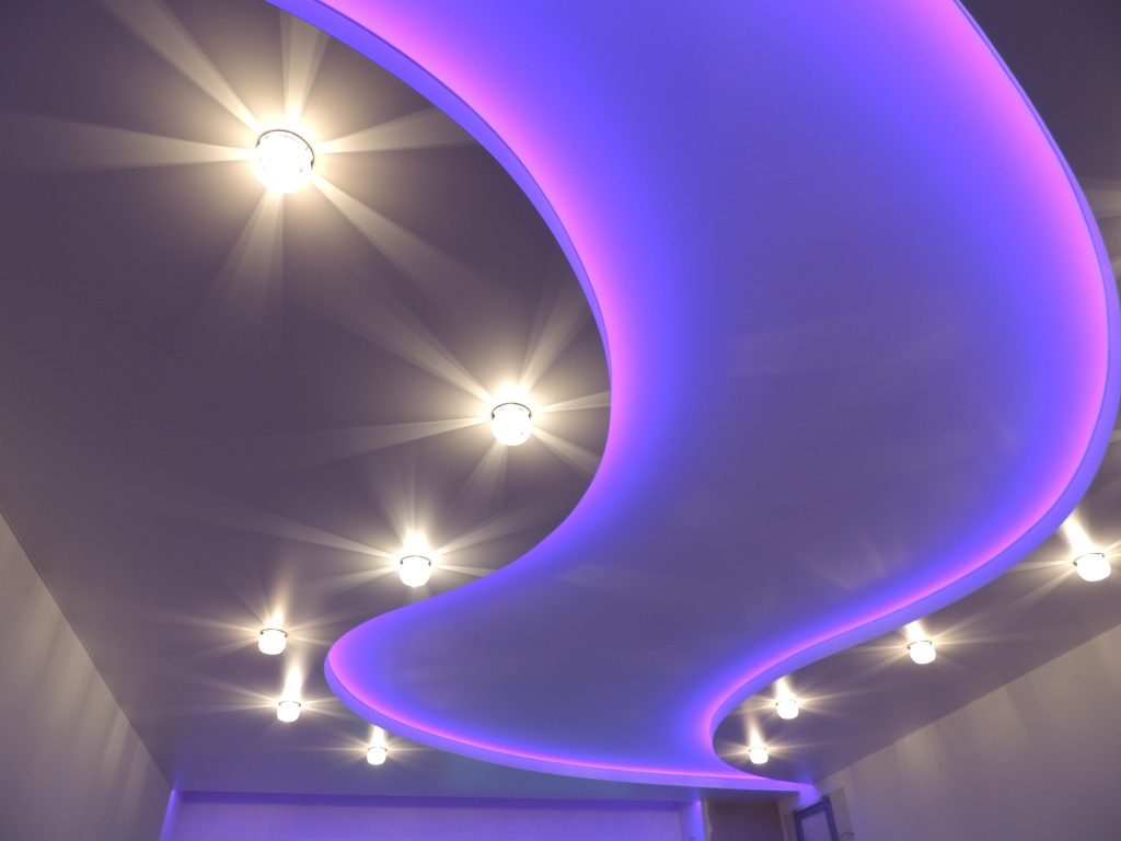 LED ceiling lighting allows you to change the color of the walls and furniture in the dark. It can have several switching modes, from flickering to static. Management occurs from the panel. The downside is the cost of mounting in a ready-made structure. It will have to be dismantled, which is not terrible for suspended ceilings, and reinstalled. Here it is possible either to mount the ceiling not end to end, then the gap will be visible during the day, or mount directly to the ceiling, then the tape will be visible. The ceiling should be white.