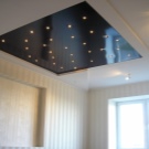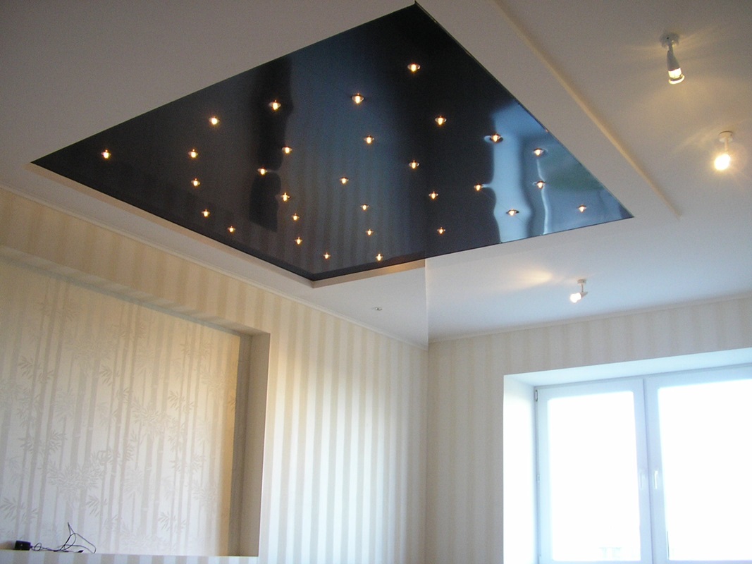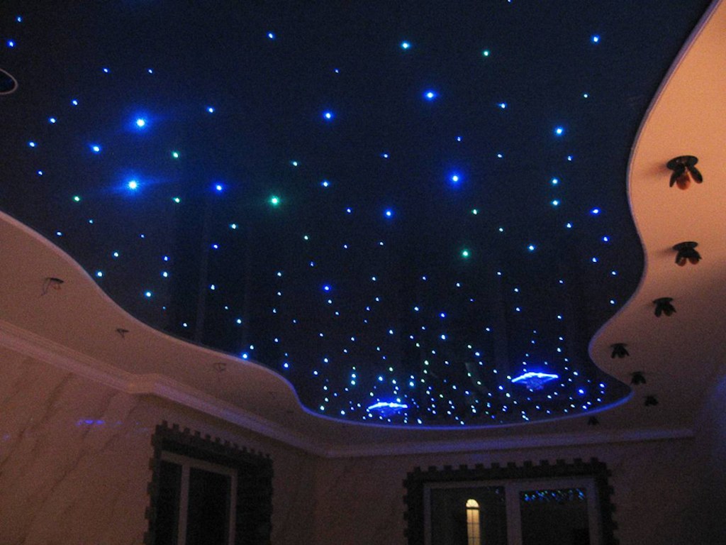 An interesting and one of the most popular options is the creation of a starry sky above your head. It is perfect for the bedroom and living room. You can admire the stars without leaving home. For such a ceiling would require fiber, which will shine through small punctures.