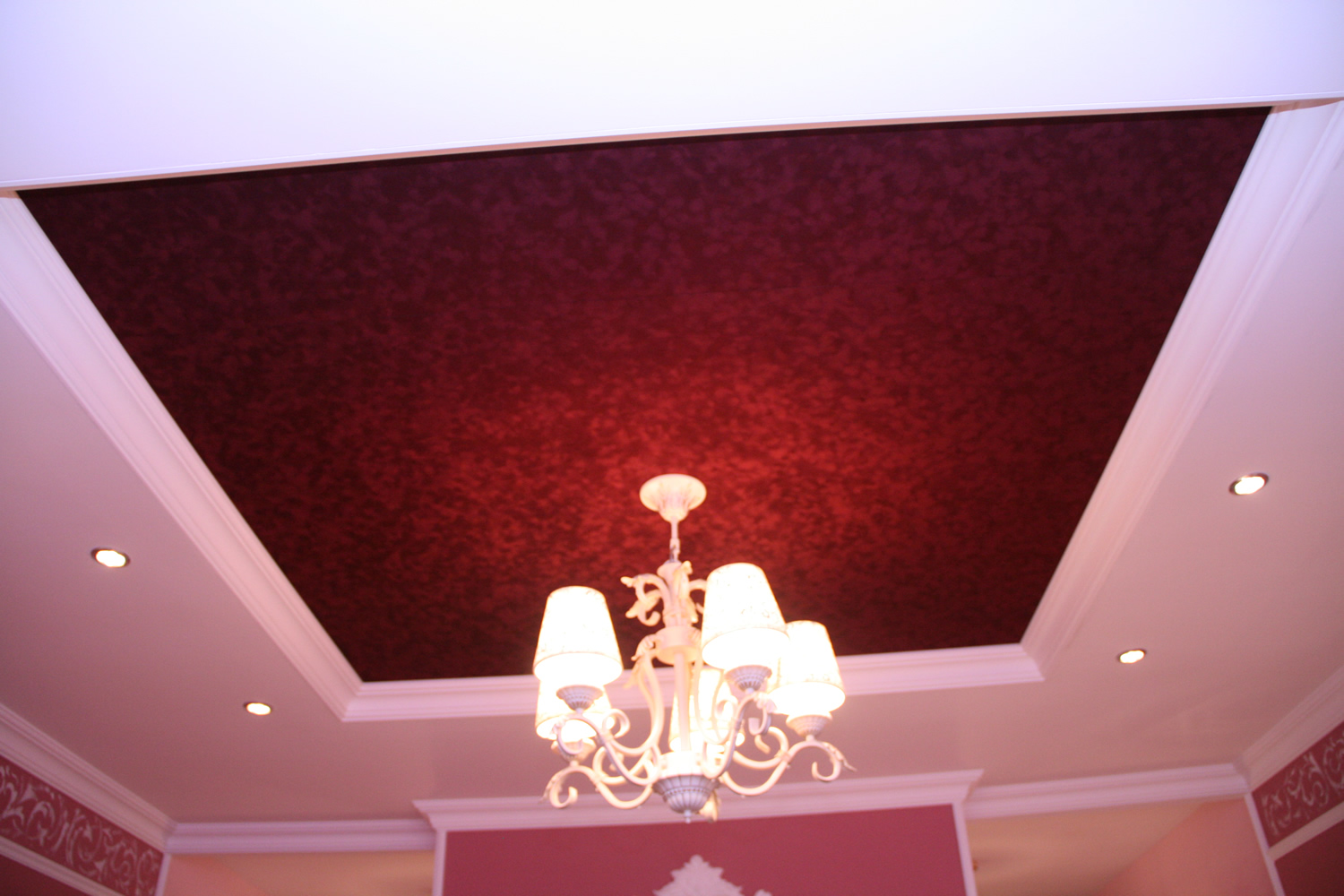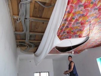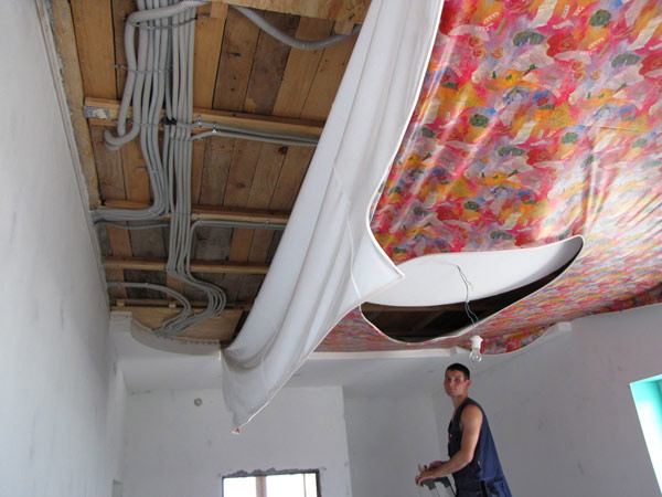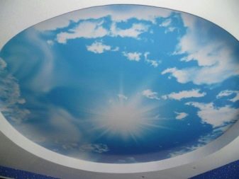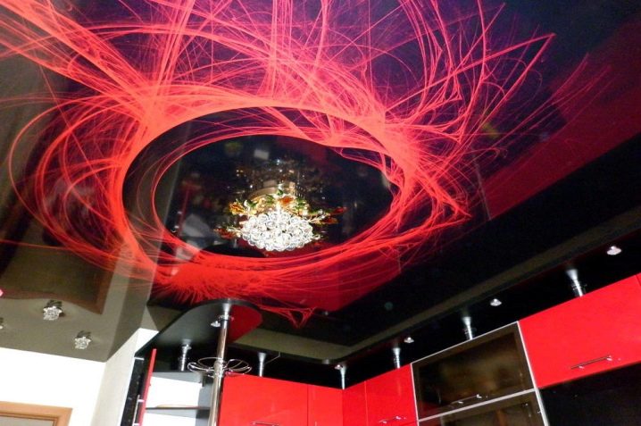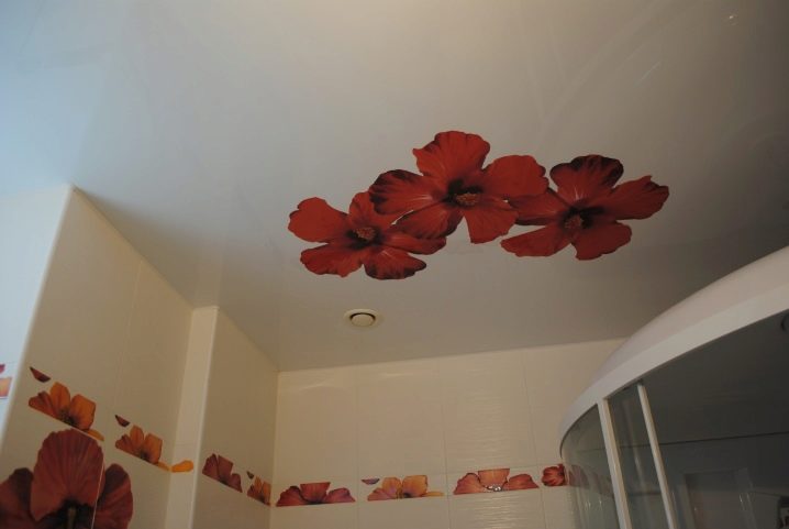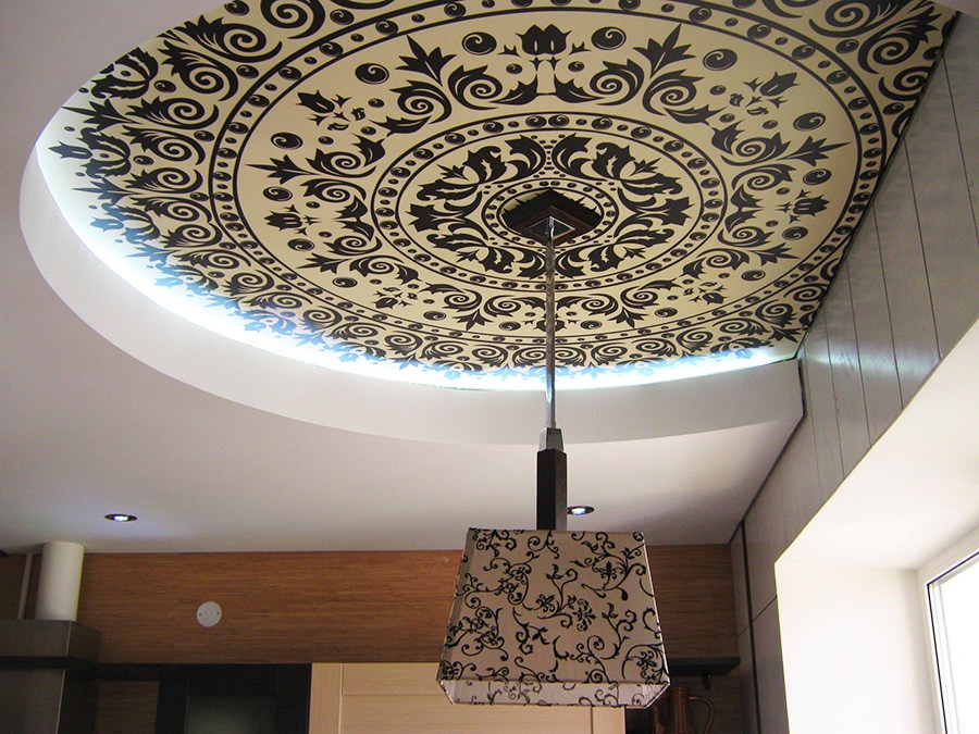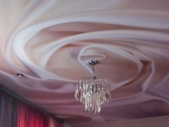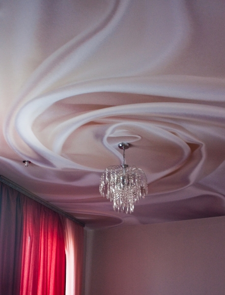 For fabric ceilings, as a rule, photo printing and acrylic paints are used. As a picture, floral motifs are most often used. You can paint such a ceiling in a monochromatic color that harmonizes with or contrasts with the color of the walls, or create a unique pattern thanks to the colors on the fabrics. Work in this case should be carried out after installation.