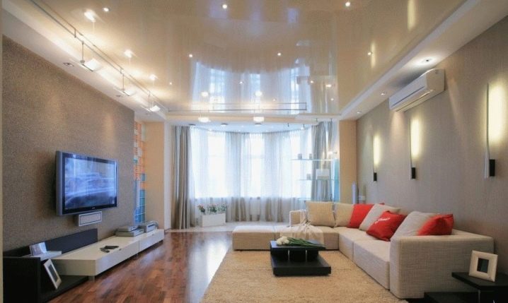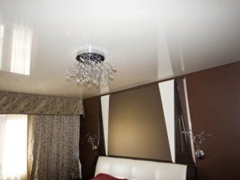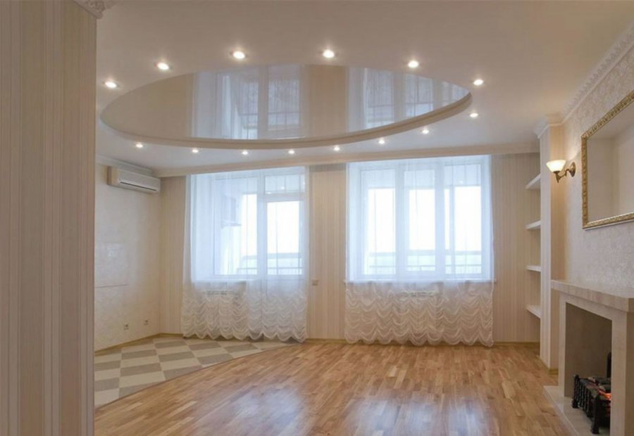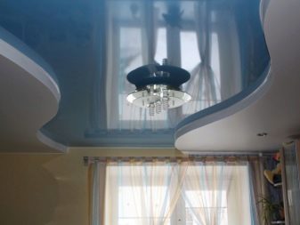 The glossy bright surface in the center allows you to highlight the bed in the center and divert attention from the wall cabinets. In the living room, the installation of such a ceiling will allow to divide the recreation area and the active area. In the hallway and bathroom such ceilings are rarely installed because of the small area.