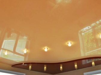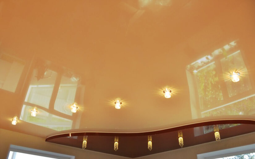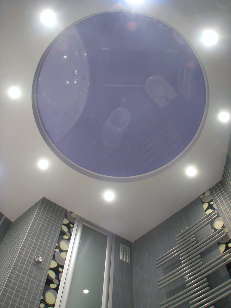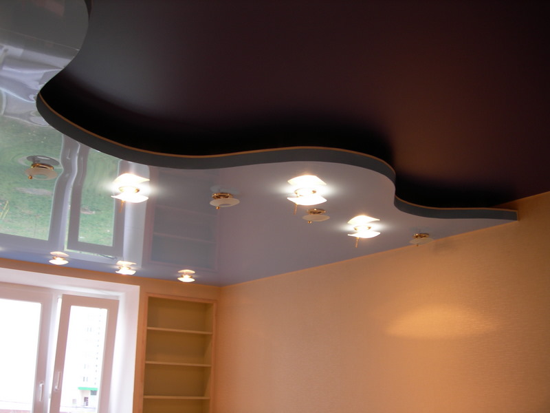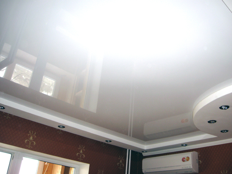 In rooms with high humidity (bathroom, kitchen) you should opt for PVC ceiling. Its glossy version will increase the space. A combination of matte and glossy material will allow you to zone the kitchen, combining the functions of the living room.