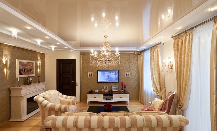When choosing a material for a ceiling covering in the living room, there are no rules. Note that glossy surface will increase the size of the room and add light to a darkened room. Matte and fabric ceilings are better suited for rooms located on the sunny side. Glossy patterns of bright colors complement the living room in the style of pop art. Ceilings "under suede" will give the living room pomp. This option perfectly complements the room in the antique style.