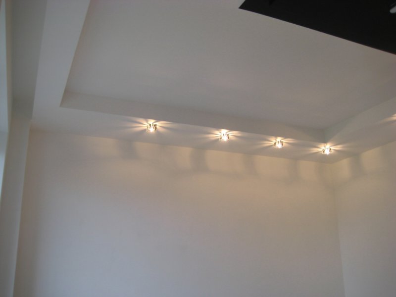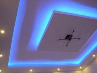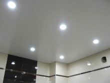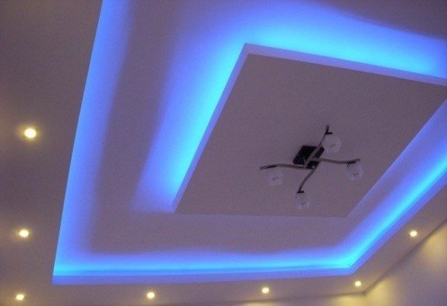 - Install LED strips or spotlights that are small in size. They must be mounted at a shallow depth, unlike the classical chandelier.You can use LED strip, which should be mounted around the perimeter of the ceiling.