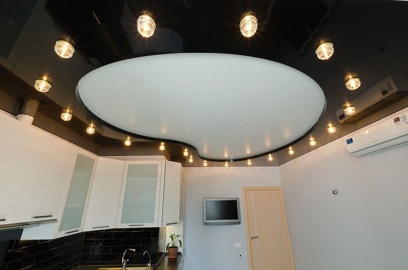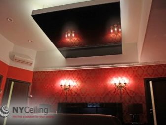 Often used a system called "starry sky." It looks most attractive in halls and halls. This is a ceiling canvas, complemented by LED or fiber-optic illumination. The star effect is created by the fluorescent coating. If a different coating is used using light generators, the ceiling will drop 20 centimeters.