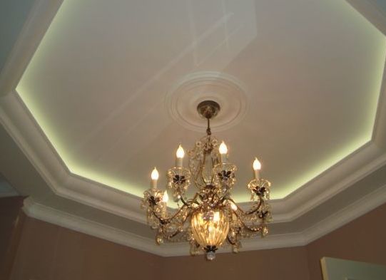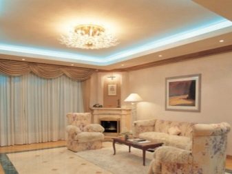 This distance allows you to equip the draft layer, where in the future will be installed lighting devices.Indoor ambient light is created by removing the tension cover from the base ceiling and using decorative lighting.
