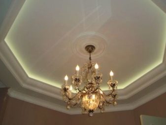 Despite the fact that the room is low, many designers prefer the classic chandelier, which is mounted on a metal hook or mounting rail. Along the perimeter, you can install LED strip or spotlights, which will create a certain atmosphere in the room.