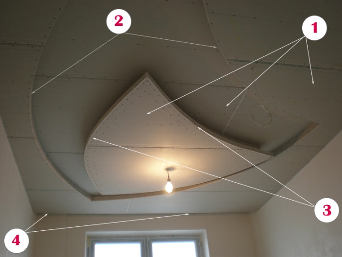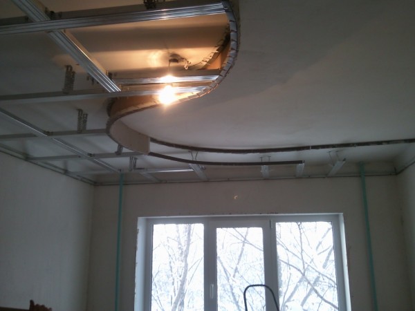 When it comes to bulk or multi-level ceilings, here we can restrict ourselves to a minimum lowering of 10 centimeters. Such constructions are usually used in medium-height rooms that are not higher than 260 centimeters.