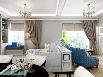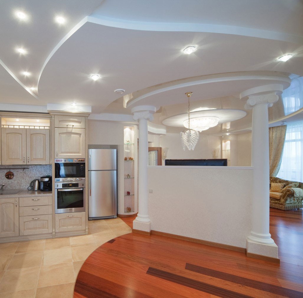 Ceilings are often used as a territory zoning tool. This allows the most competent and comfortable use of space, especially when it comes to a small apartment or house. The territory is visually broken due to the difference in color, design and shape.