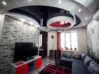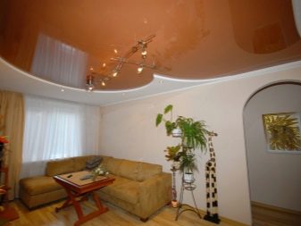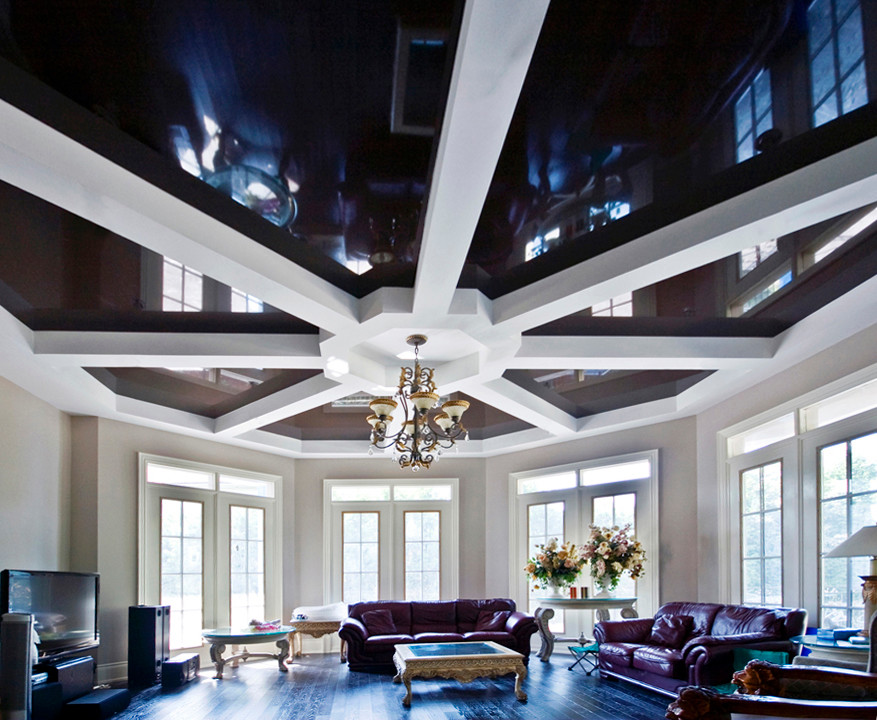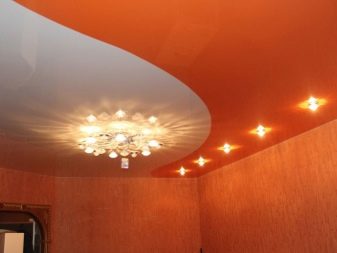 In the case of two-level ceilings, designers can use canvases of various types. Reception of contrast is achieved through a combination of two colors. The junction can be the boundary of a specific zone for the visual separation of the room into locations.