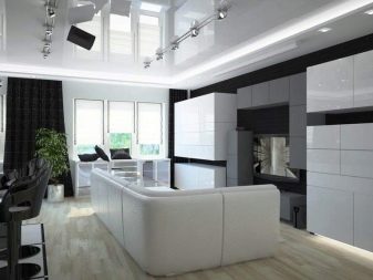Be sure to consider the style of the interior. Each decorative direction has certain design requirements. Modern high tech to minimalism. It is characterized by futuristic shapes, neutral colors and chrome elements. This stretch ceiling is complemented by small LED lights.