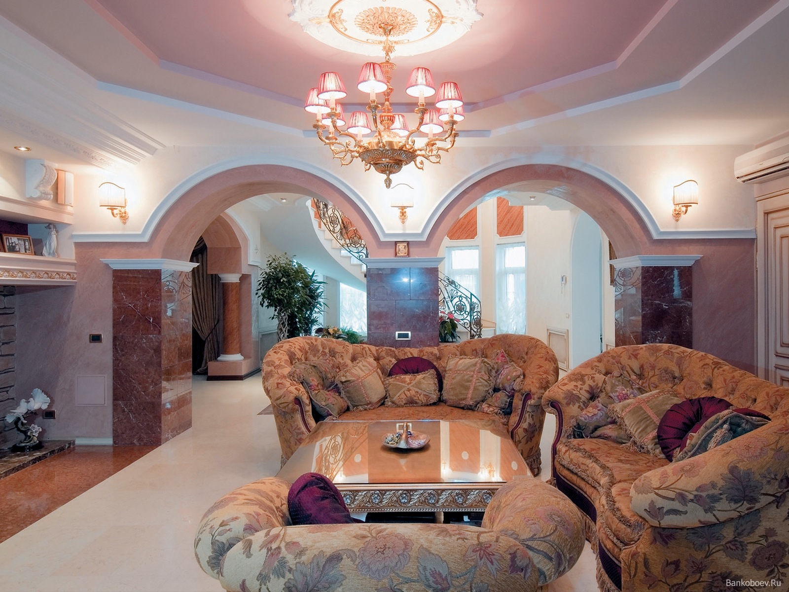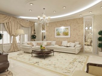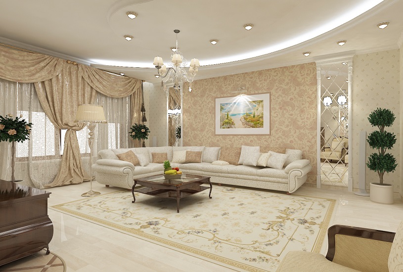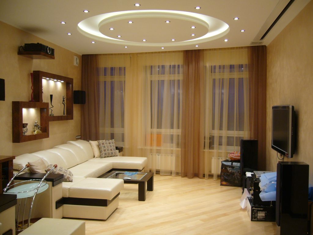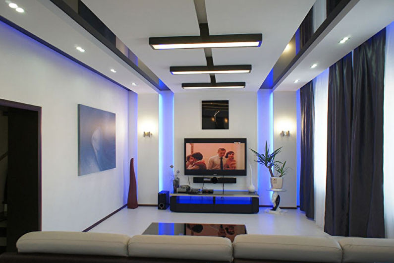 - Living room. As a rule, the living room or hall is the largest room in the house. In this case, the design perfectly cope with the role of emphasis in the interior.Multi-level frame and a combination of contrasting colors - the best solution for a spacious room with high ceilings. Complete the composition lighting devices. It can be a luxurious chandelier with pendants and gilding or a lot of miniature spotlights.