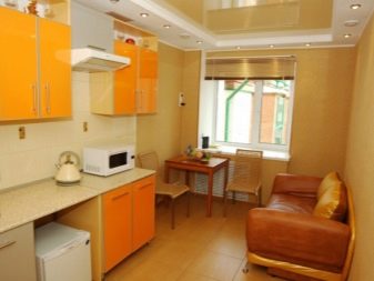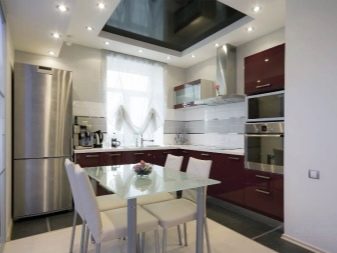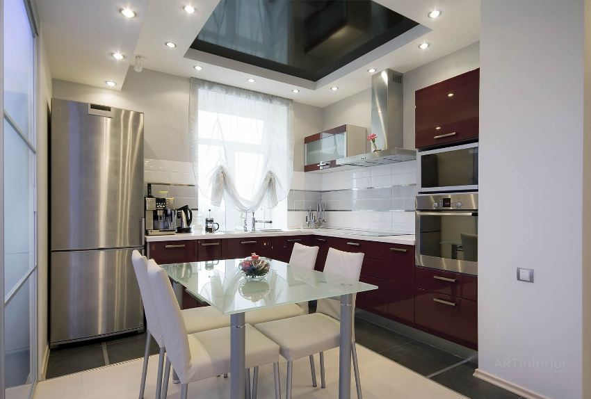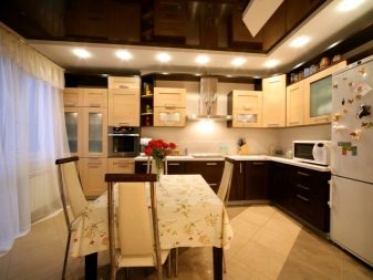 The kitchen often accumulates pollution and various odors. In this regard, as a stretch fabric for this room, it is desirable to use a film. It is much easier to clean compared to the fabric base, besides the film almost does not absorb odors. Fabric linen will look more harmonious in the bedroom or living room.