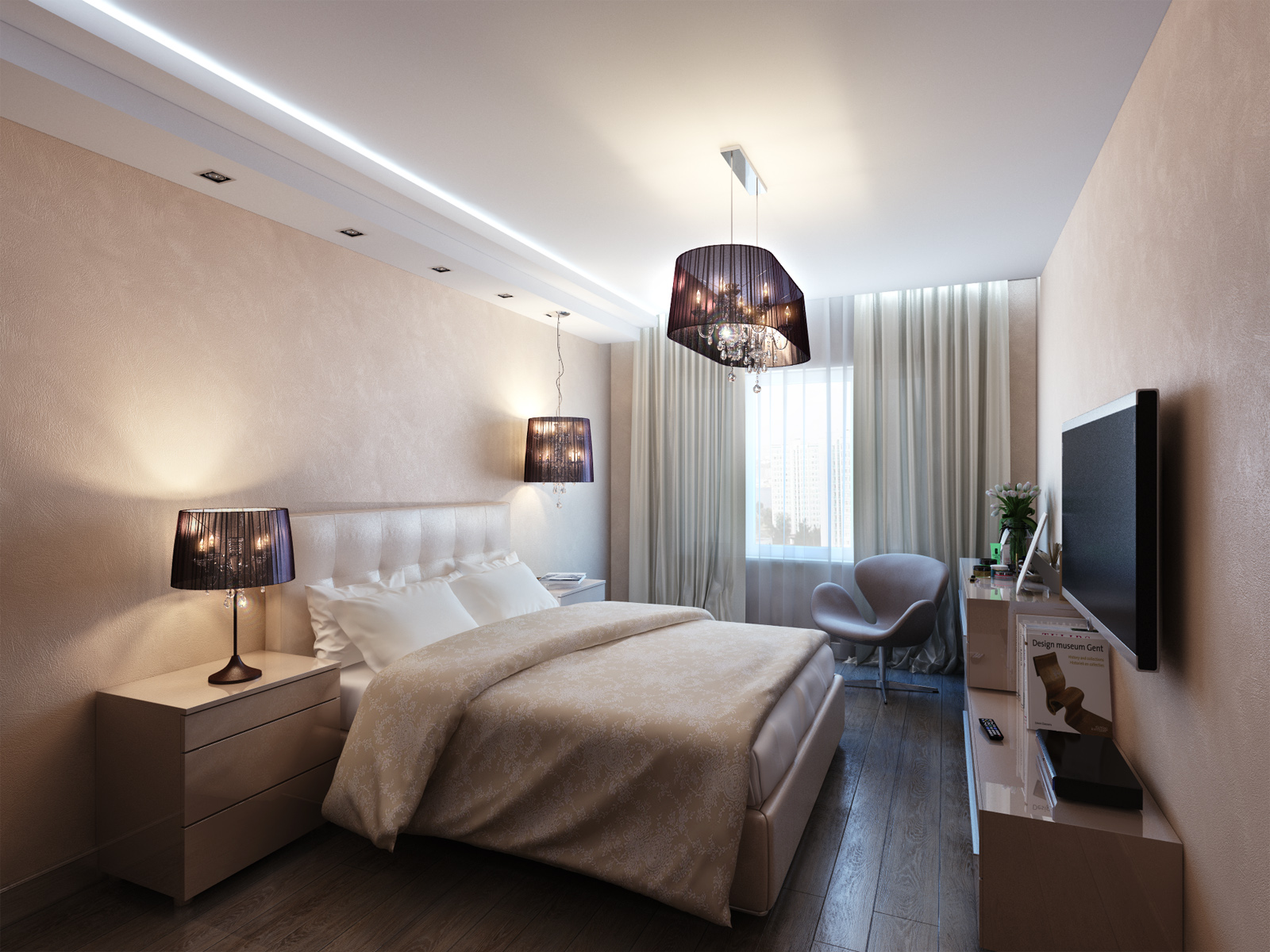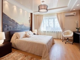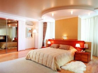 - Bedroom. In the bedroom should reign tranquility, relaxation and tranquility. Designers strongly recommend choosing light, neutral and sleeping colors. A common palette is beige, cream, lilac, delicate pink, sky blue, peach. The effect of the "starry sky" is very popular. If you want to draw attention to the stretch ceiling, choose a white plasterboard box.