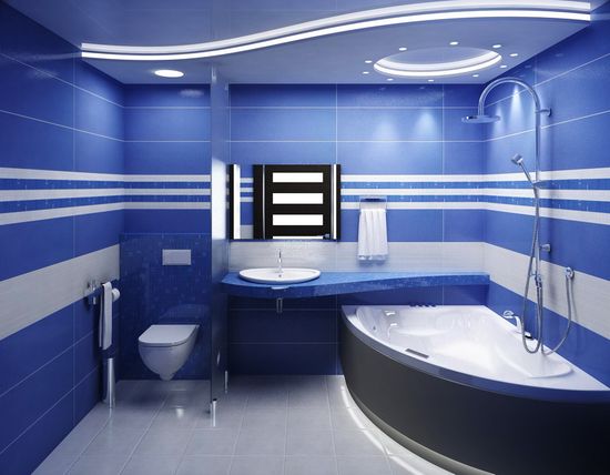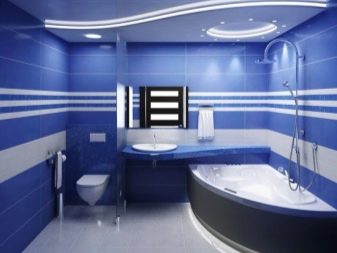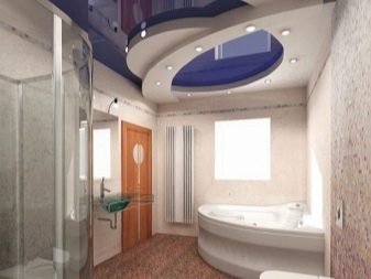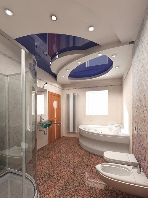 - Bathroom. In the bathroom stretch ceilings are rare, but it is possible. Cloths in neutral colors (gray, beige and their shades) on plasterboard bases will help to muffle the contrasting combinations in the room. More colorful and eye-catching options will dilute a uniform finish palette.