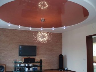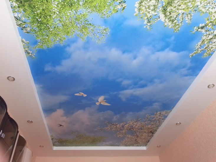 - Geometry. Many opt for round or oval frames. Fabric or film fabric is placed in the center. Reception is often used to create the "starry sky" effect.To imitate the daytime sky, this design option is also suitable. Experts identify such a design flaw - the corners additionally overlap with plasterboard, due to which the dimensions of the room become visually smaller.
