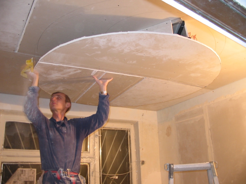 Drywall does not exert strong pressure on the walls due to low weight. If necessary, the material can be given any shape. Gypsum stretch ceiling can be mounted on the wall of the same material, without fear of deformation of the frame.