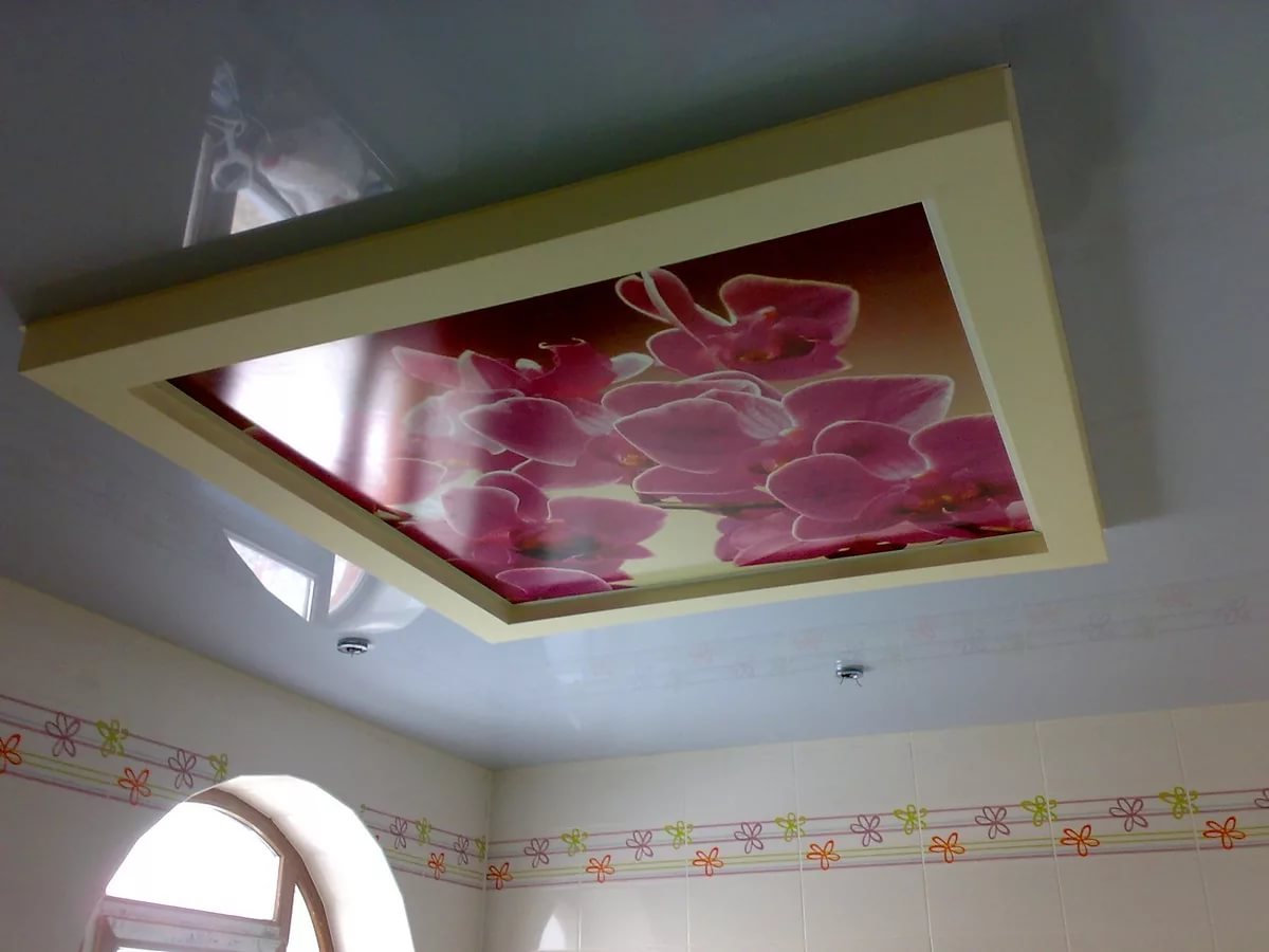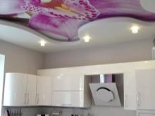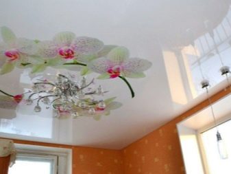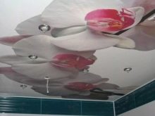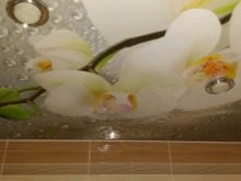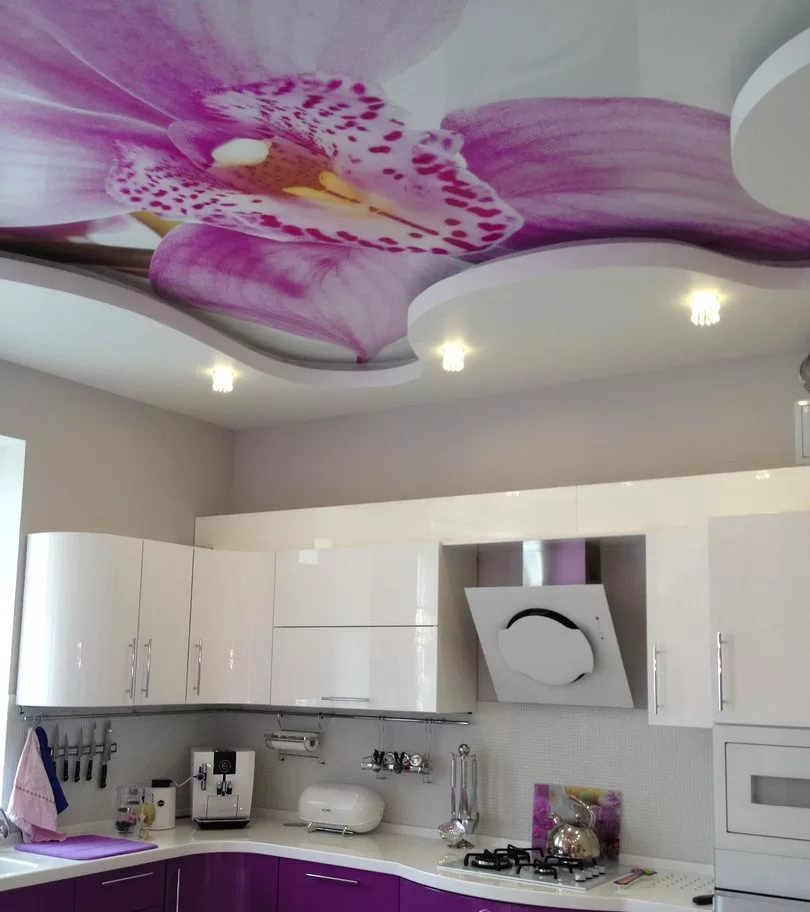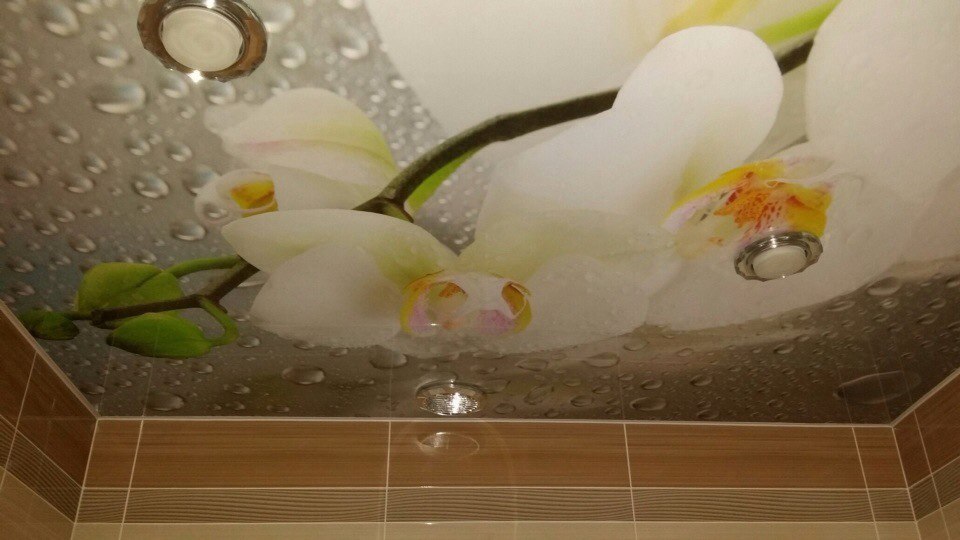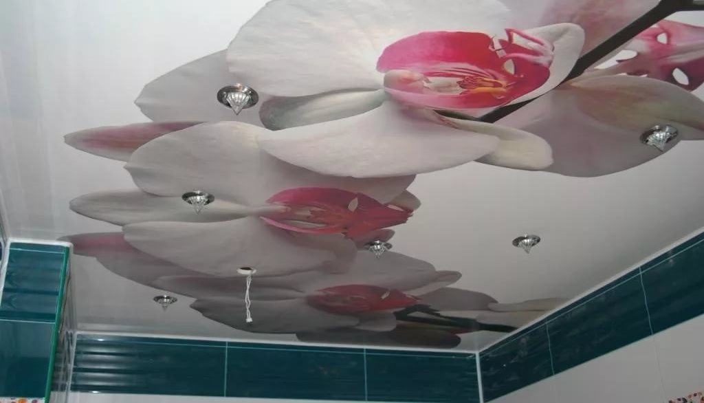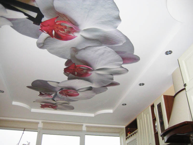 The kitchen is a great place for ceiling decoration with orchids. Warm green, sunny yellow, red or white with yellow shades will bring warmth, joy and a sense of intimacy with nature into the design. In the bathroom, a canvas with beautiful flowers can be chosen in a non-standard blue-blue range.