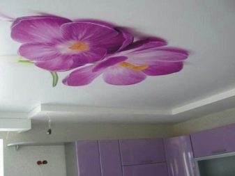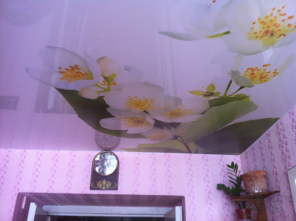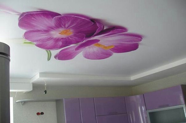 Women and girls will not remain indifferent at the sight of such a ceiling in their room. For young hostesses choose more delicate, light, small images., so as not to overload the eye. For adults, you can apply more radical and large textures.. Adolescents or dynamic natures can be emphasized by the exotic patterns of the ceiling with a multi-colored illumination to match: for example, violet-lilac inflorescence lilac lamps. Lighting will add mystery and fabulousness to the interior.