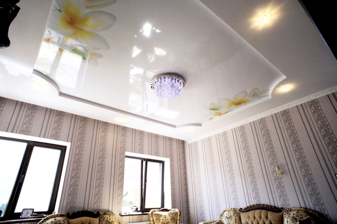 Lighter images in white, blue, green, pink colors will take root in the living room. Freshness and spring lightness will add the presence of green leaves on the image. Spotlights provide good illumination and give the space a height thanks to the reflection in the glossy ceiling.