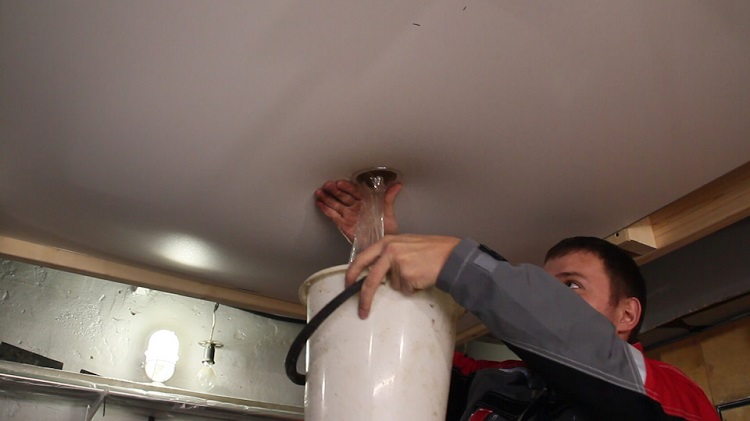 - Moving water on the ceiling to the place of discharge you will not help, and further aggravate the situation. Because water will spill over the entire surface of the ceiling.