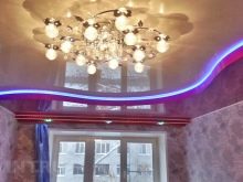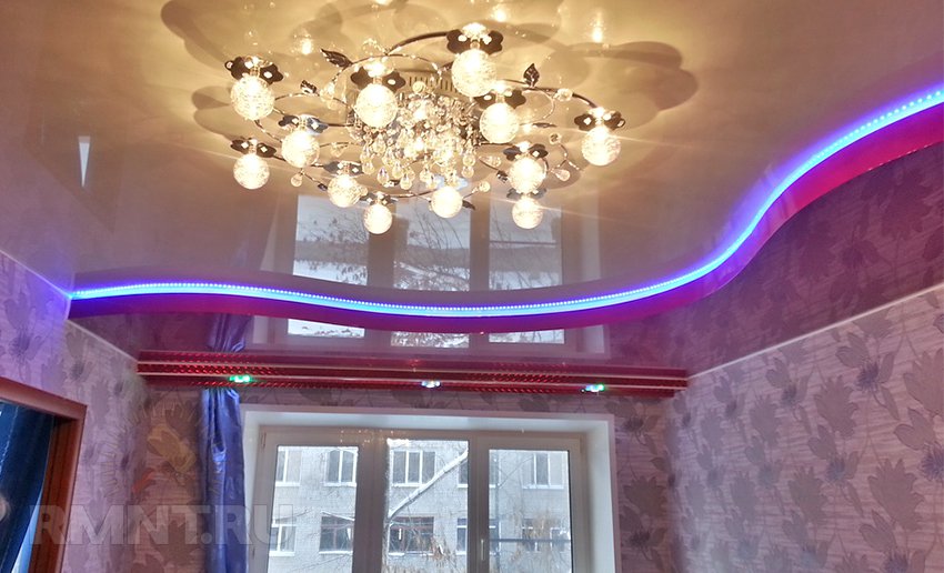 - To make the ceiling more interesting and attractive, you can use LED strip. As a rule, it is installed around the perimeter of the canvas. The stores sell ribbons of various colors.