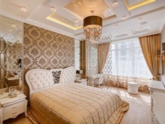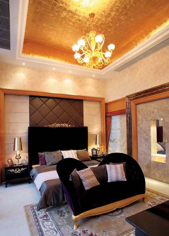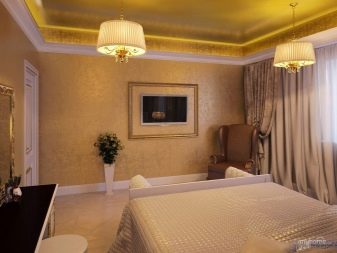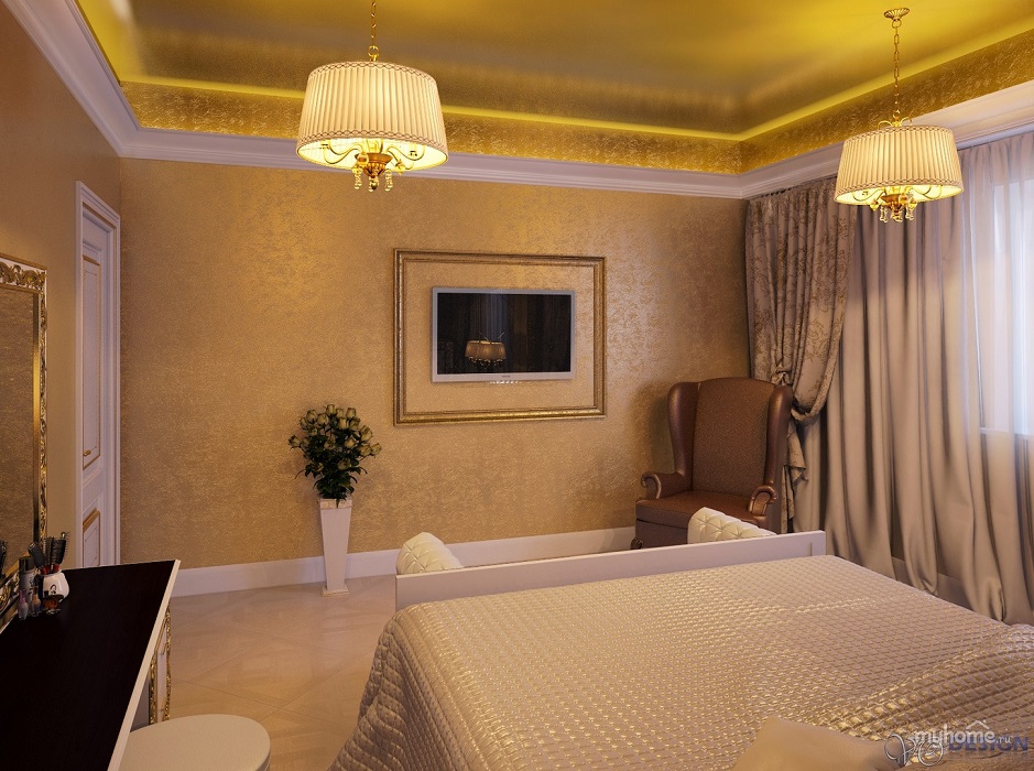 For more elaborate ensembles stretch ceilings with a surface of gold are perfect. These paintings look expensive and elegant. but they are recommended to be combined with a simpler wall decorationotherwise the ensemble may turn out to be too “heavy”.
