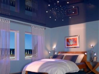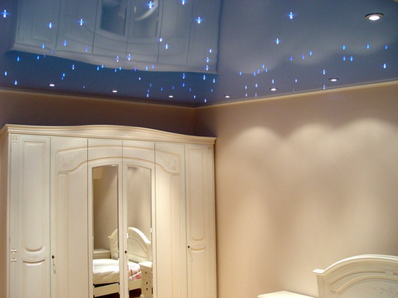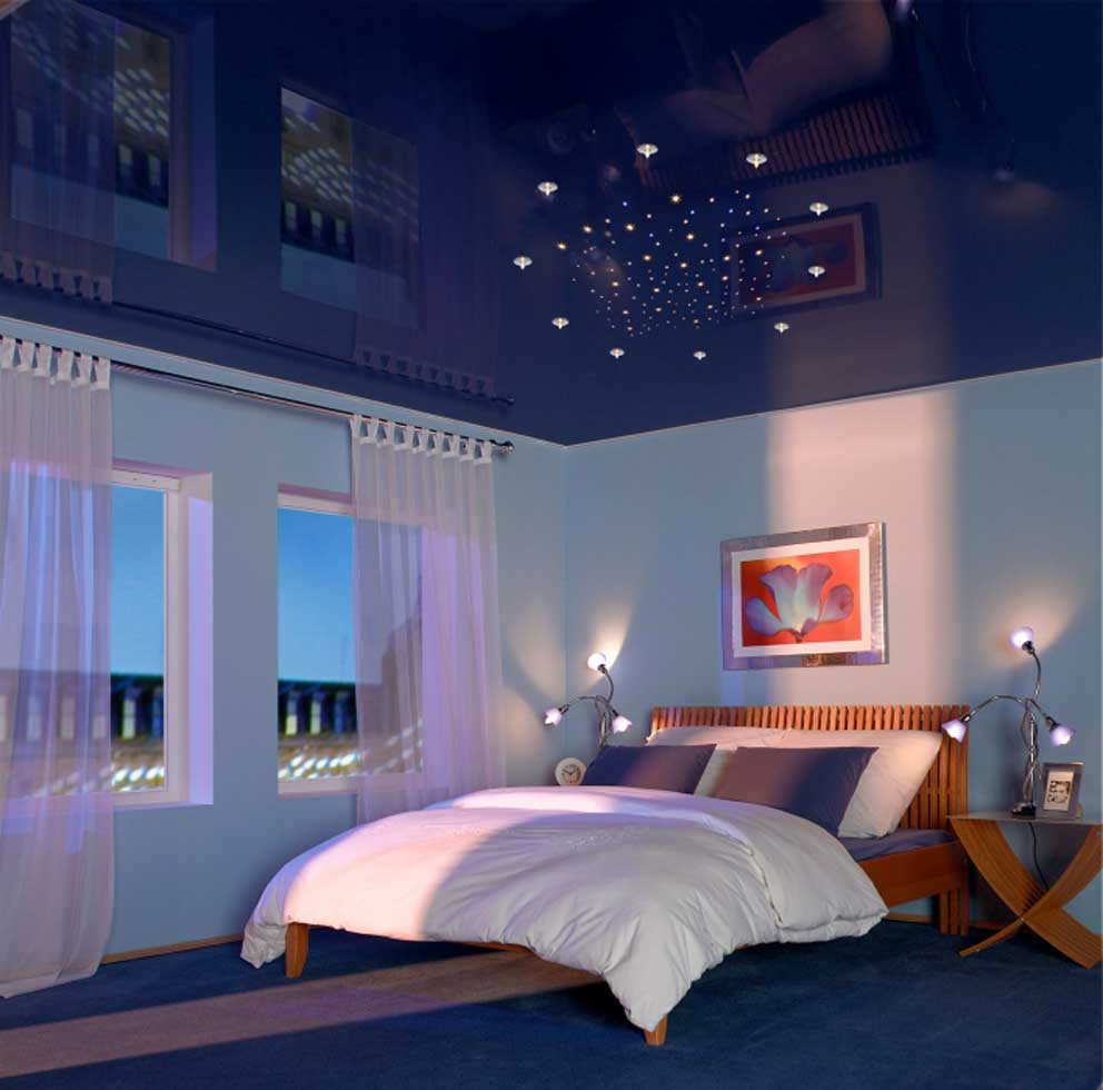 The glossy dark blue ceiling can be placed in the bedroom with soft blue walls and blue carpet on the floor. A laconic wooden bed with small wooden side tables will look organically in such a room.As the lighting will look great scattering of small light bulbs that form a circle.