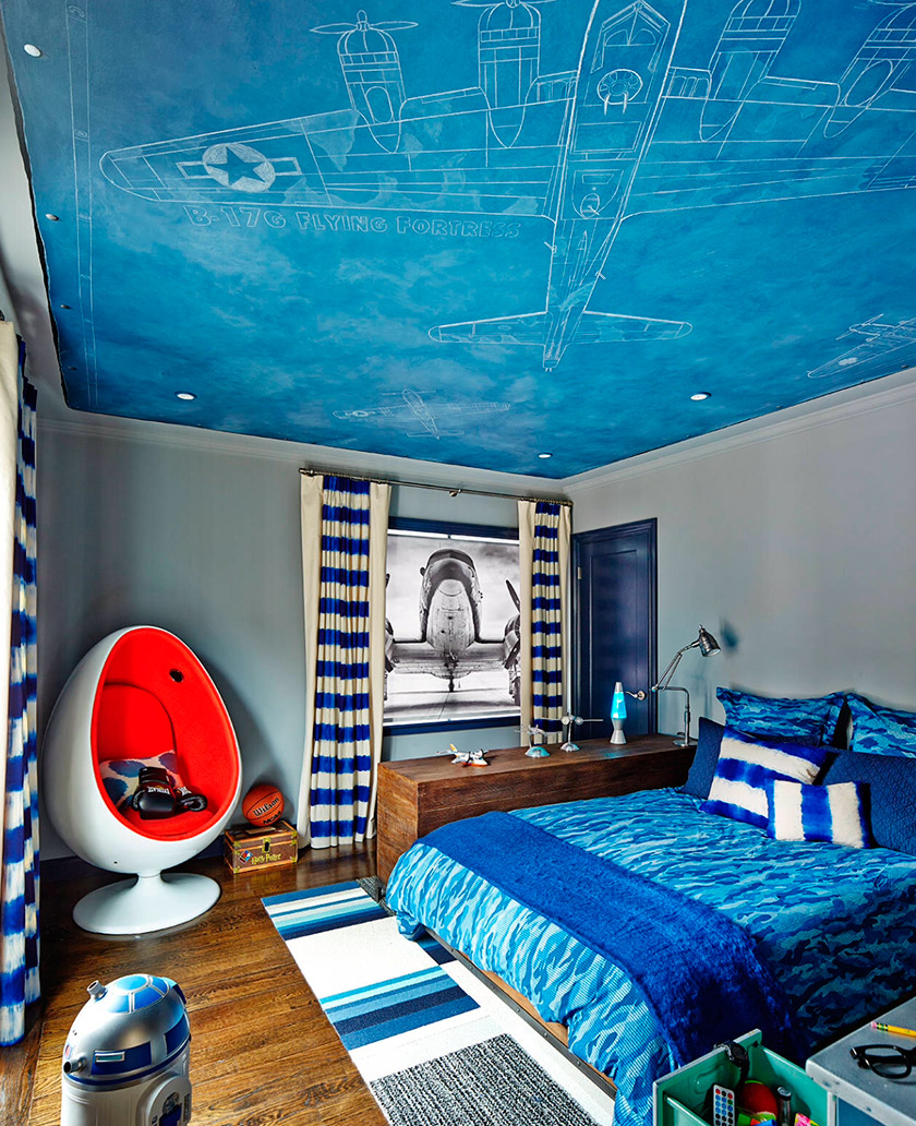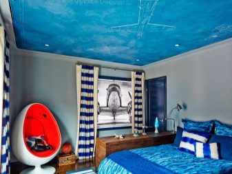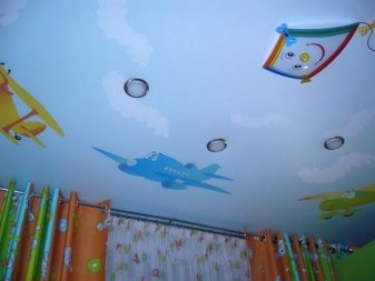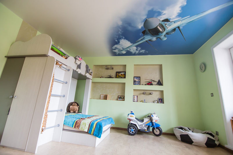In the bedroom of a little boy ceilings with images of cars and cartoons will look harmoniously. Monochrome options are also permissible. For the boy's room fit blue, green and blue colors.
