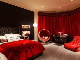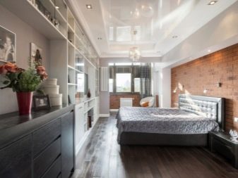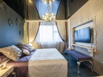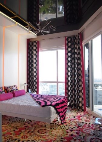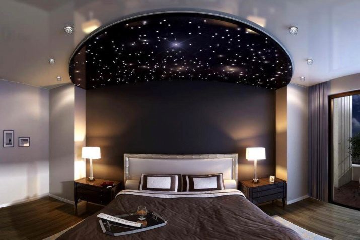 Very boldly in the bedroom will look black stretch ceiling. Psychologists are skeptical of such a design decision, arguing that such a dark color of the ceiling will have an extremely depressing effect on the owners.. However, many people still turn to this design of the bedroom, as it comes to their taste.