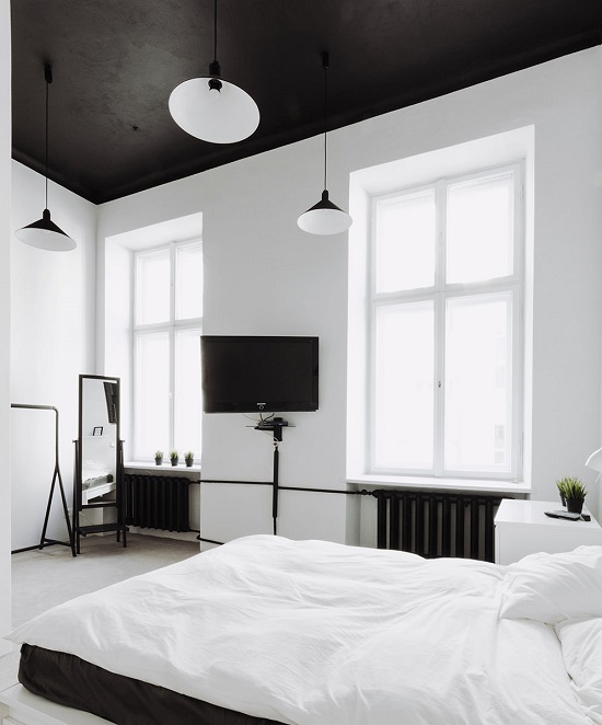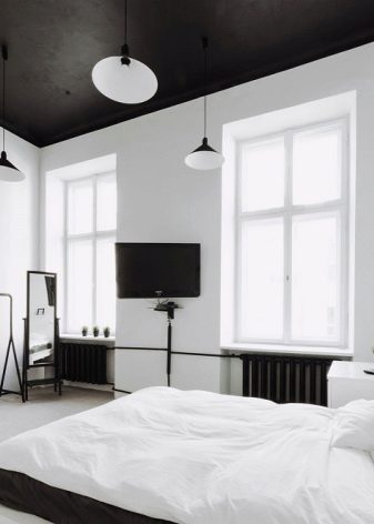 If you are determined to turn to the black ceiling, then you should take into account that they will make the room too small. In addition, the rest of the details in the interior should not be the same dark, otherwise the space will simply merge into a single black spot.