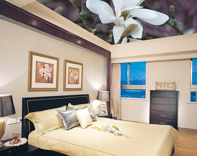 The bedroom can be installed and colored ceiling. Best suited for this blue, green, pale blue and pink canvas. Saturated red, orange, purple and yellow paints excite the nervous system of a person, therefore it is better to refuse such colors in the design of a bedroom - they will interfere with fast falling asleep and healthy sleep.