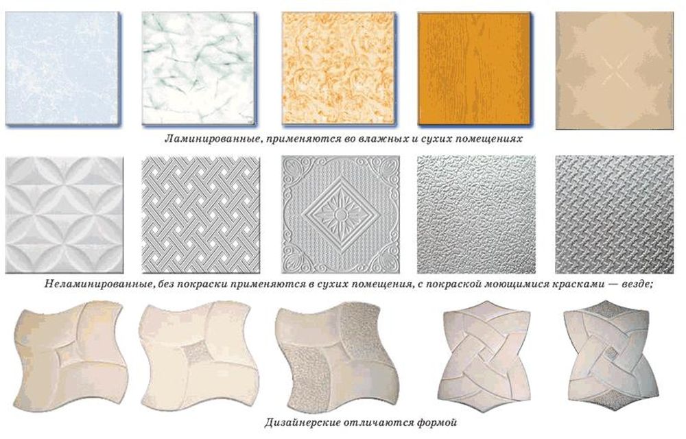 So, for finishing rooms with high humidity (bathroom, kitchen) you should choose the type of ceiling tile with laminated coating, and for drier ones, you can also choose a simple tile with a porous structure.
