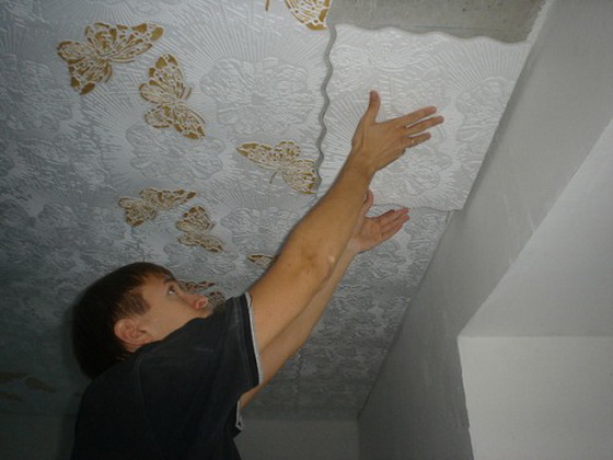 - if the surface of the ceiling has a curvature, for example, due to the overlap of the floor slabs, then it is necessary to level the surface or seal up the dents and chipped with putty;