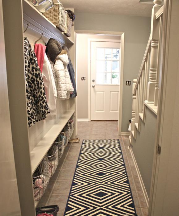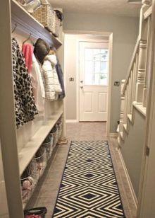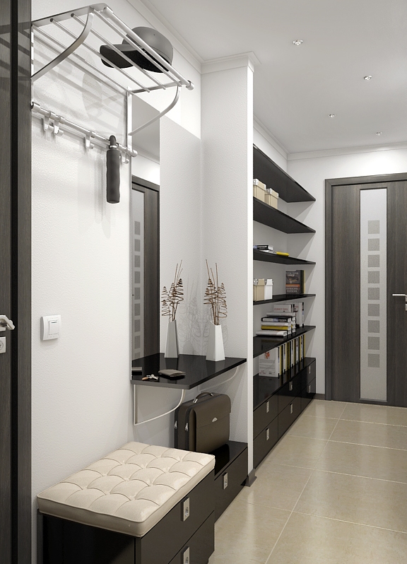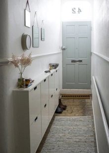 - Shelving: A free vertical surface in a narrow corridor can be used for open-type shelving by placing shelves and a hook system for clothes.If this composition is painted in a light color, then visually it will not dominate the rest of the space.