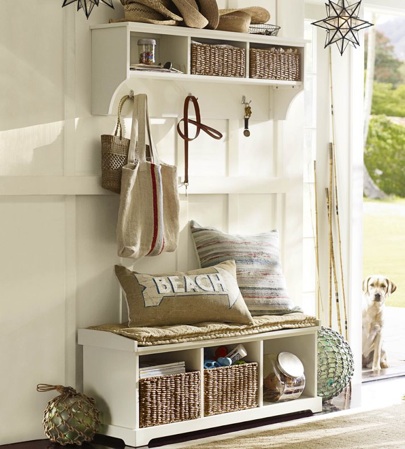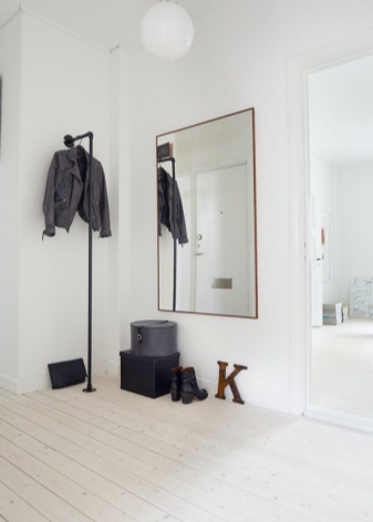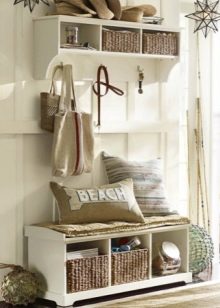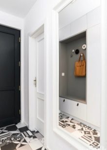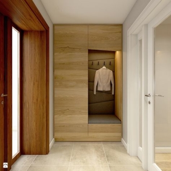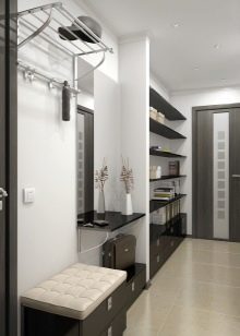 When selecting furniture, its functional purpose is taken into account, therefore they are guided by the initial minimum of objects - a wardrobe, shelves, a mirror and hangers. All of them should fit easily without creating a sense of bias.