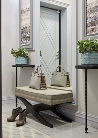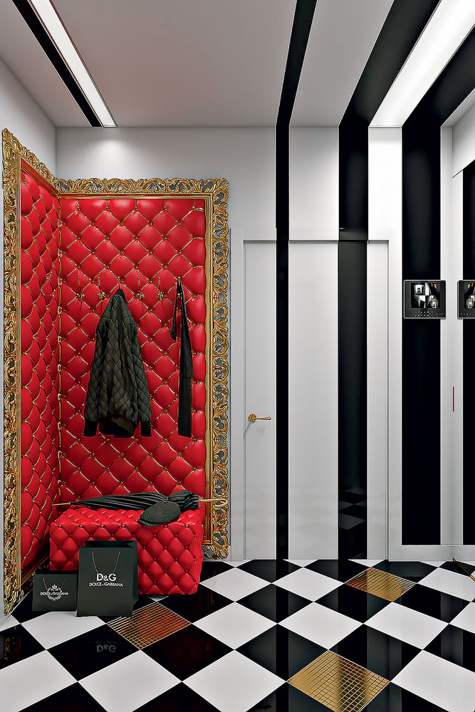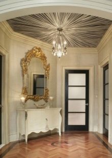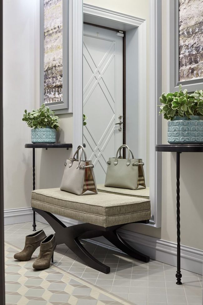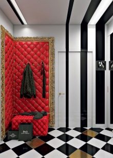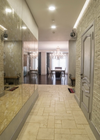 It is impossible to remain indifferent to the hallway, made with modern materials in the Empire style. With a minimal amount of furniture, the feeling of chic design will not leave anyone indifferent.